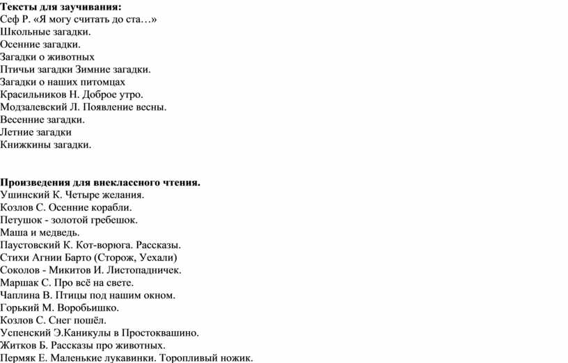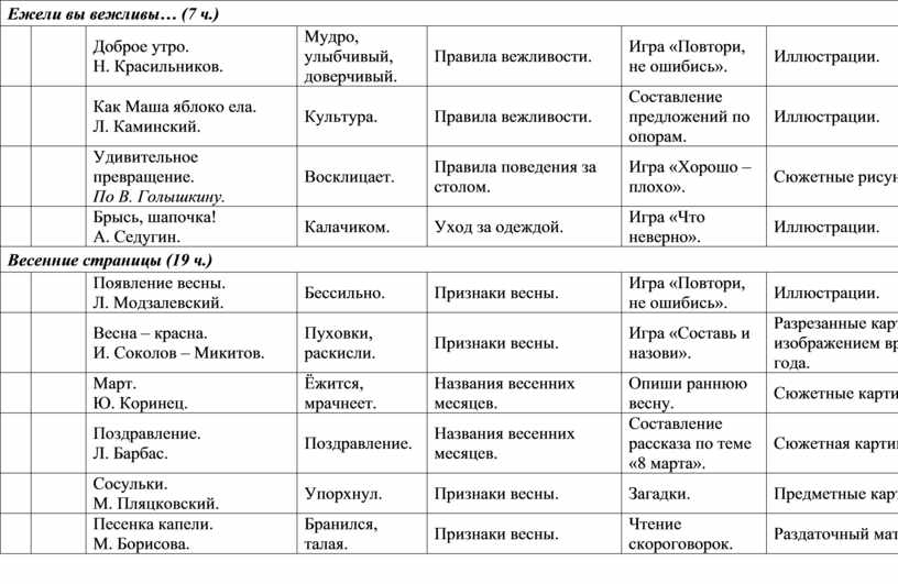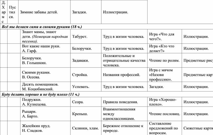 Небольшие по объему произведения, отрывки из произведений о жизни детей в школе, об обязанностях и делах школьников; о хороших и плохих поступках детей; о дружбе и товарищеской взаимопомощи; о семье; о труде взрослых; об участии в домашнем труде детей; о знаменательных событиях; об изменениях в природе, о жизни животных и растений в разное время года.