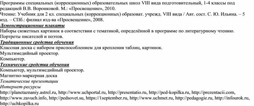Программы специальных (коррекционных) образовательных учреждений VIII вида, под редакцией В. В. Воронковой по предмету «Чтение и развитие речи». М.: «Просвещение», 2010 г.