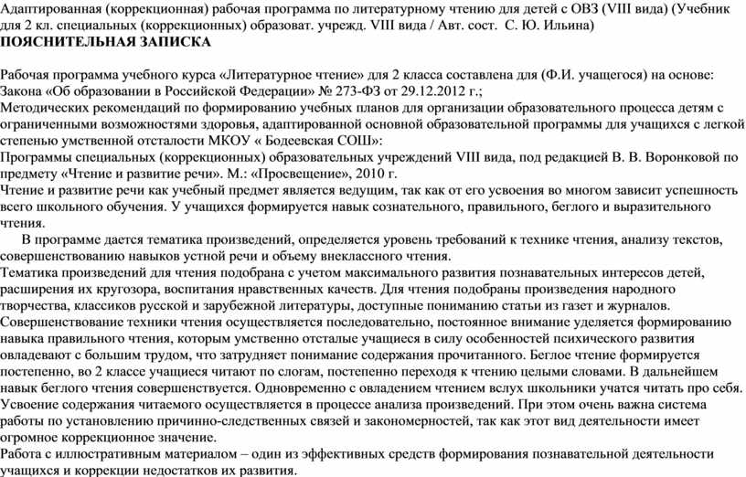 Адаптированная (коррекционная) рабочая программа по литературному чтению для детей с ОВЗ (VIII вида) (Учебник для 2 кл. специальных (коррекционных) образоват. учрежд. VIII вида / Авт. сост. С. Ю. Ильина)