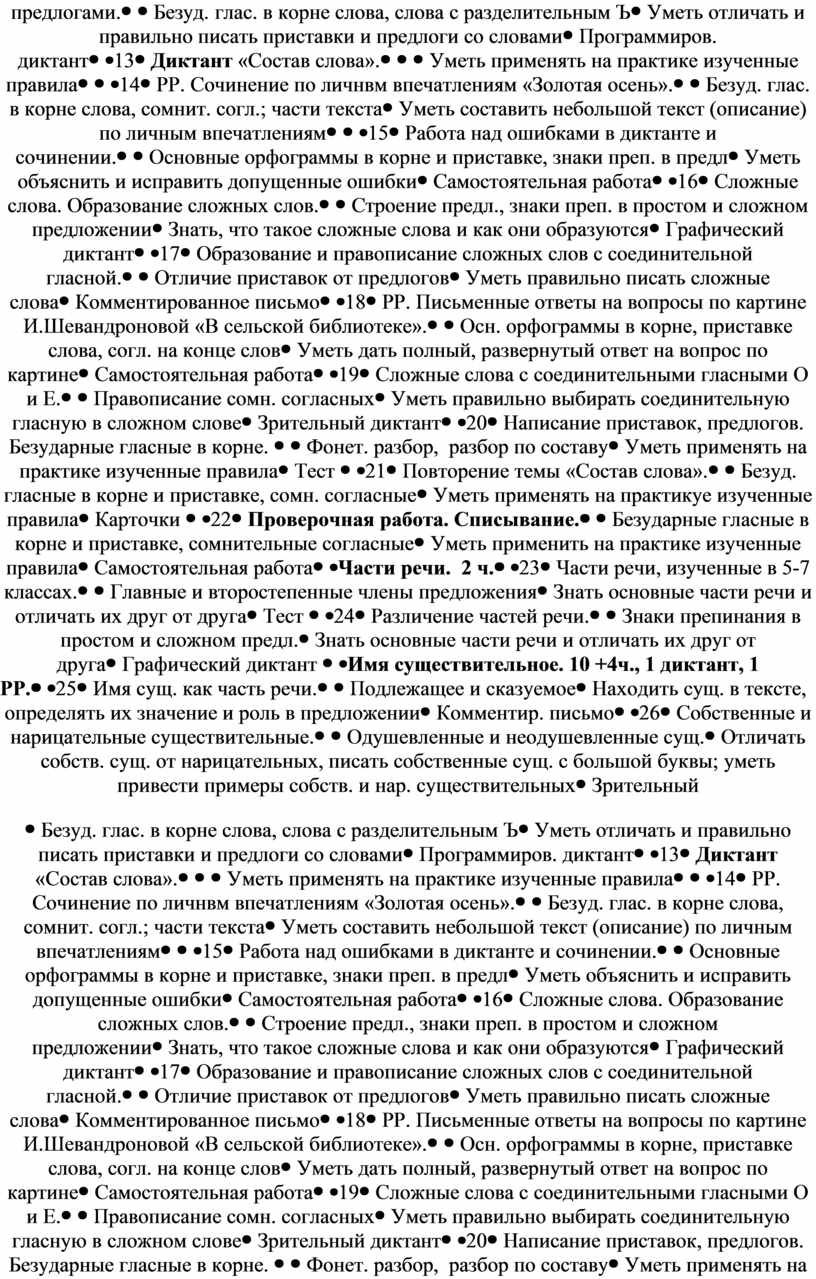 Состав слова (13 часов, 1 диктант, 1 проверочная работа (списывание), 2 РР). Однокоренные слова; подбор однокоренных слов, относящихся к рызличным частям речи, разбор их по составу. Единообразное написание звонких и глухих согласных, ударных и безударных гласных в корнях слов. Образование слов с помощью приставок и суффиксов. Сложные слова. Образование сложных слов с соединительными гласными и без соединительных гласных. Уметь подбирать проверочные слова при написании проверяемых безударных гласных в корнях слов, сомнительных согласных на конце слова, непроизносимых согласных в корнях слов. Уметь отличать предлоги от приставок, правильно писать предлоги и приставки со словами. Знать написание наиболее распространенных предлогов и приставок. Уметь объяснять значение слов путем подбора однокоренных слов. Уметь разбирать слова по составу.