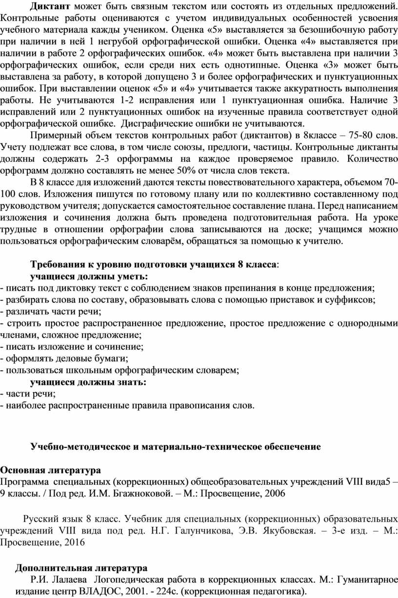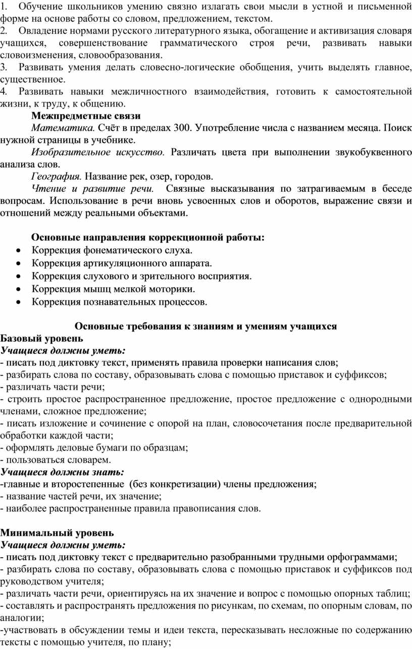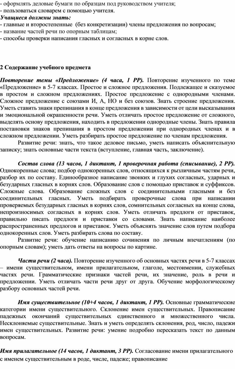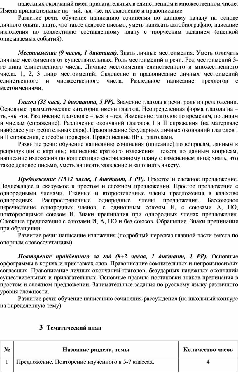 Развитие речи: обучение написанию сочинения (описание) по вопросам, данным к репродукции с картины; написание краткого изложения текста по данным вопросам, написание изложения по коллективно составленному плану с изменением лица; знать, что такое деловое письмо, уметь написать заявление и заполнить анкету.
