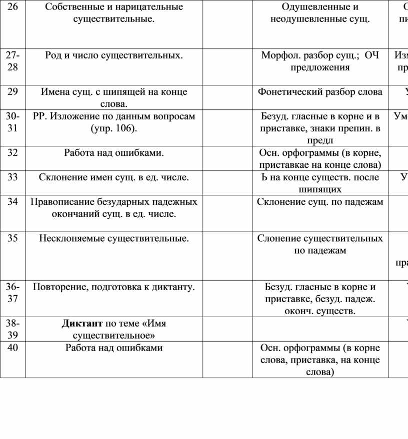 Имя существительное (10+4 часов, 1 диктант, 1 РР). Основные грамматические категории имени существительного. Склонение имен существительных. Правописание падежных окончаний существительных единственного и множественного числа. Несклоняемые существительные. Знать и уметь определять склонения, род, число, падежи имен существительных. Развитие речи: умение подробно пересказать текст по данным вопросам.