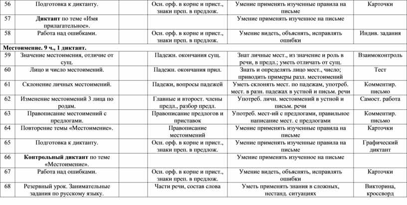 Местоимение (9 часов, 1 диктант). Знать личные местоимения. Уметь отличать личные местоимения от существительных. Роль местоимений в речи. Род местоимений 3-го лица единственного числа. Личные местоимения единственного и множественного числа. 1, 2, 3 лицо местоимений. Склонение и правописание личных местоимений единственного и множественного числа. Раздельное написание предлогов с местоимениями.