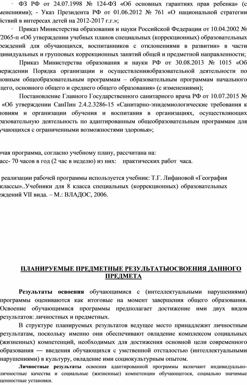 При реализации рабочей программы используется учебник: Т.Г. Лифановой «География 6-9 классы»..Учебники для 8 класса специальных (коррекционных) образовательных учреждений VII вида. – М.: ВЛАДОС, 2006.