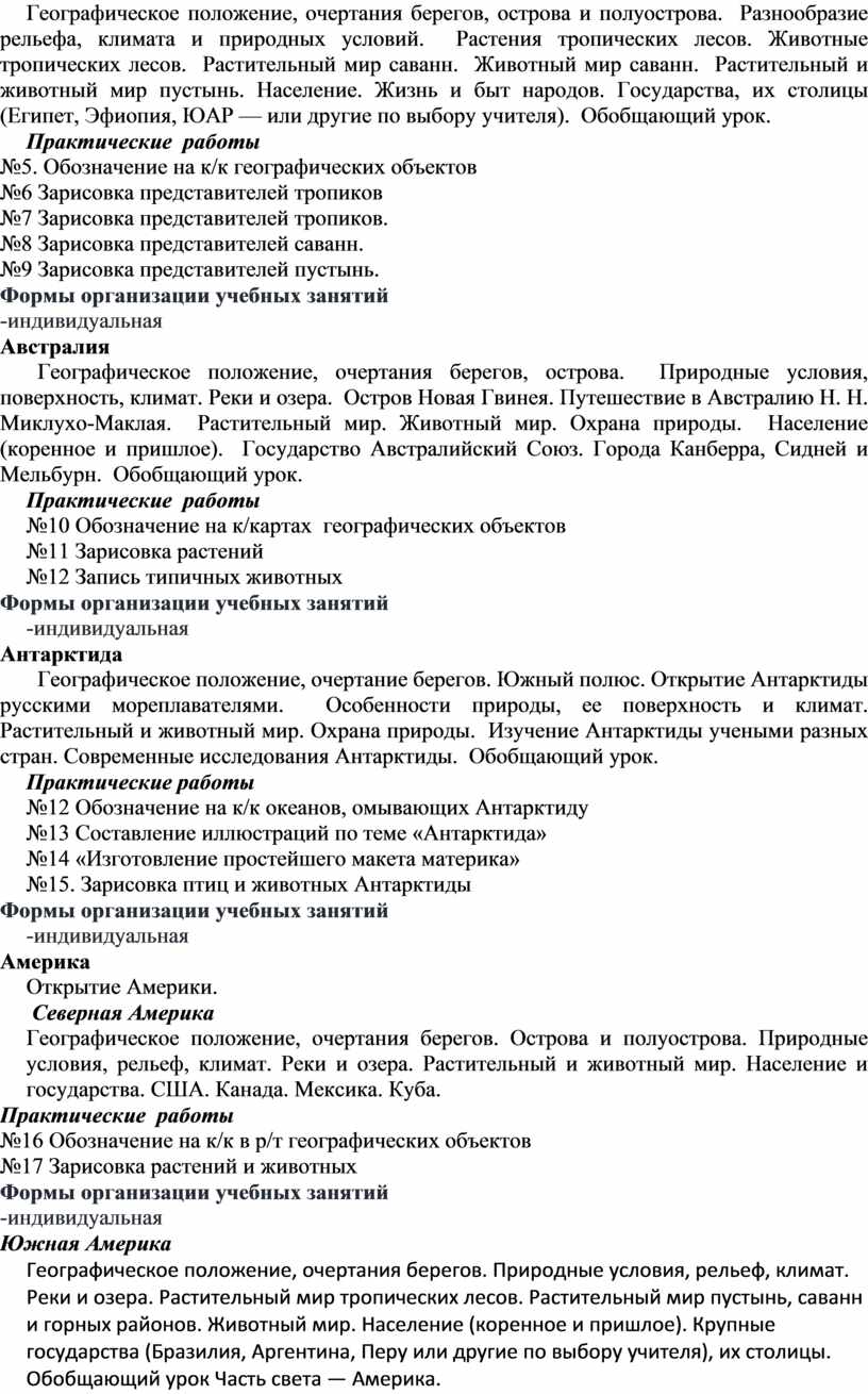 Географическое положение, очертания берегов. Природные условия, рельеф, климат. Реки и озера. Растительный мир тропических лесов. Растительный мир пустынь, саванн и горных районов. Животный мир. Население (коренное и пришлое). Крупные государства (Бразилия, Аргентина, Перу или другие по выбору учителя), их столицы. Обобщающий урок Часть света — Америка.
