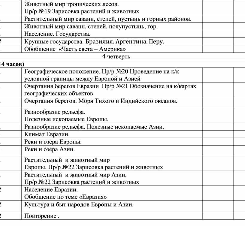 Евразия — величайший материк земного шара. Географическое положение. Части света: Европа и Азия. Условная граница между ними. Очертания берегов Евразии. Крупнейшие острова и полуострова. Поверхность, природные условия и полезные ископаемые Европы. Разнообразие рельефа, природных условий и полезные ископаемые Азии. Типы климата Евразии. Водные ресурсы Европы, их использование. Экологические проблемы. Реки и озера Азии. Их использование. Экологические проблемы. Растительный и животный мир Евразии. Международное сотрудничество в охране природы. Население Евразии. Различия по плотности населения. Народы Евразии. Культура и быт народов Европы и Азии. Обобщающий урок.