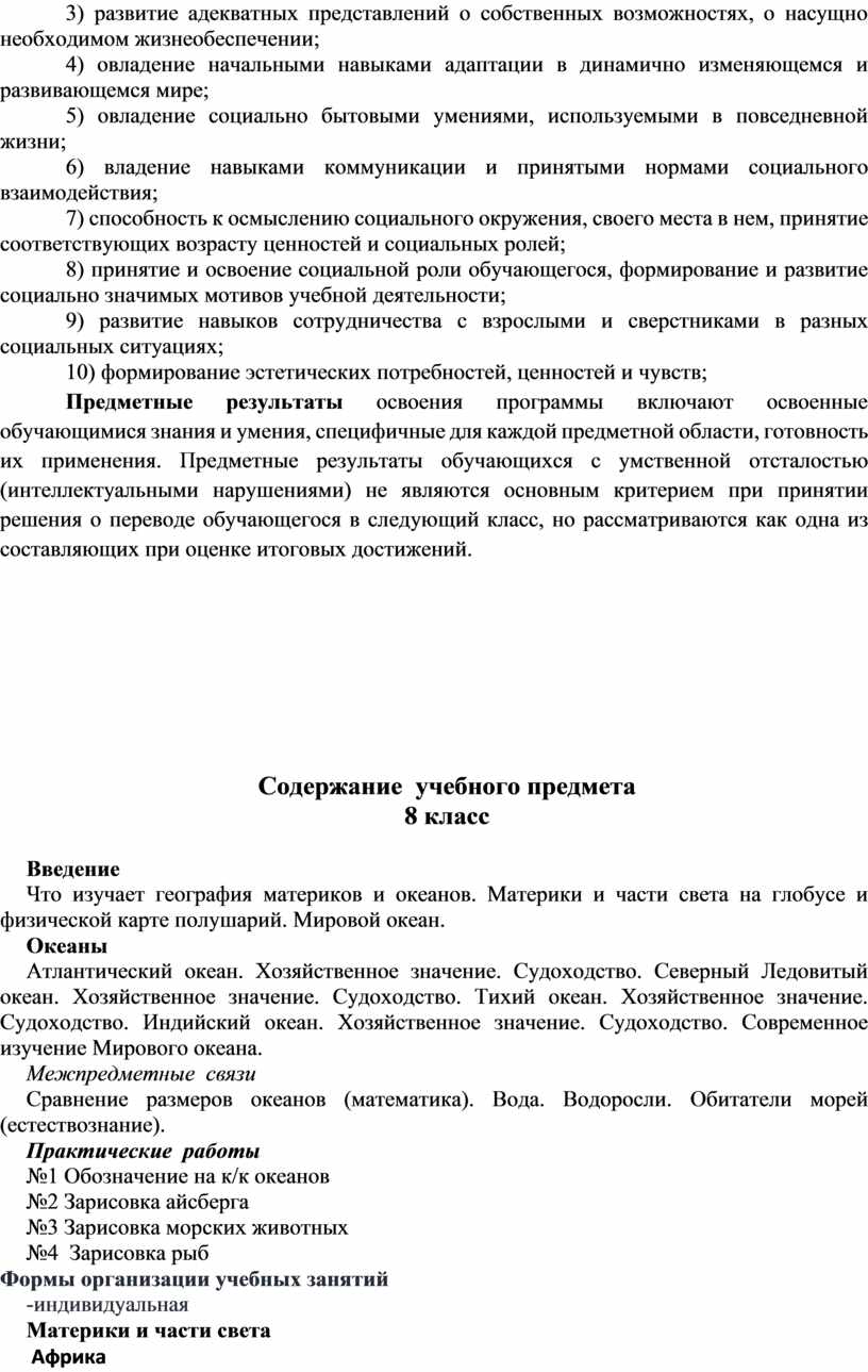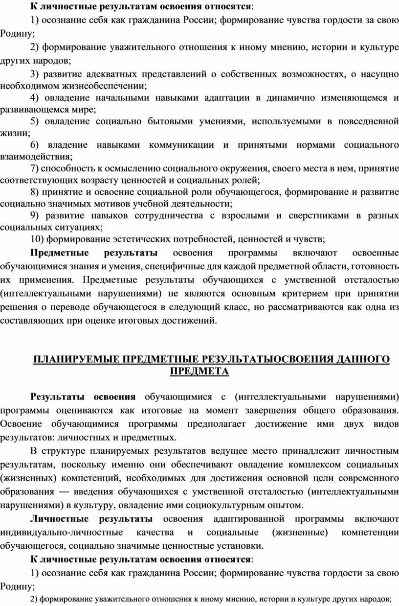В структуре планируемых результатов ведущее место принадлежит личностным результатам, поскольку именно они обеспечивают овладение комплексом социальных (жизненных) компетенций, необходимых для достижения основной цели современного образования ― введения обучающихся с умственной отсталостью (интеллектуальными нарушениями) в культуру, овладение ими социокультурным опытом.