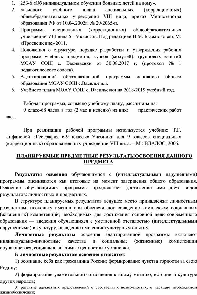 7. Адаптированной образовательной программы основного общего образования МОАУ СОШ с.Васильевки.