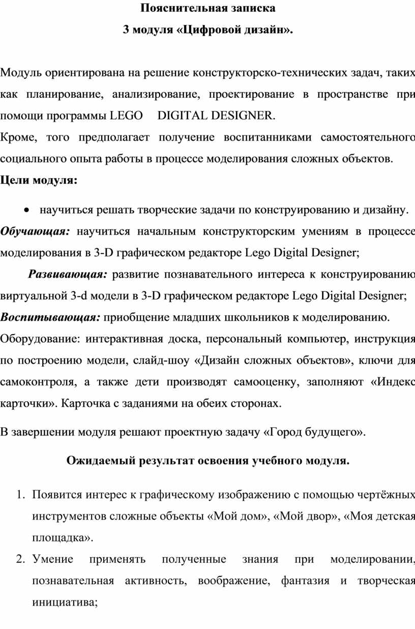 Программа рассчитана на детей младшего школьного возраста от 8-10 лет, которые проявляют повышенный интерес к техническому творчеству с применением программного обеспечения LEGO DIGITAL DESIGNER (лего-дизайн).