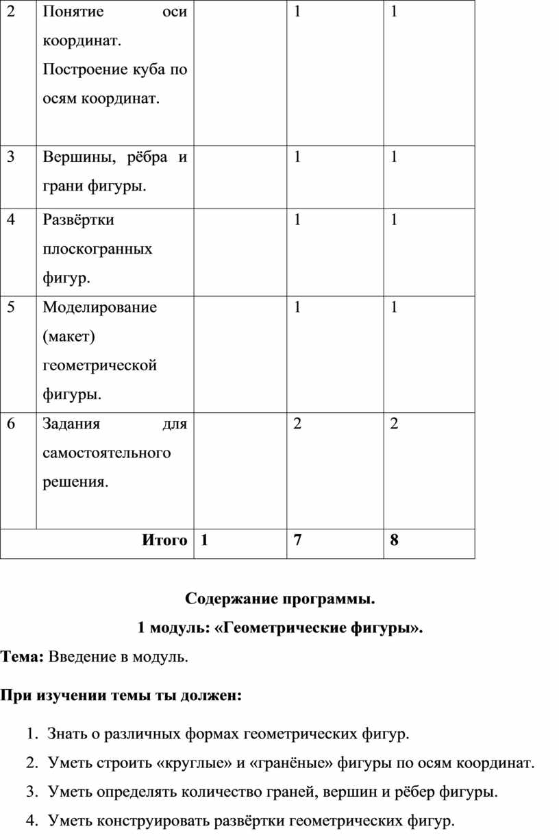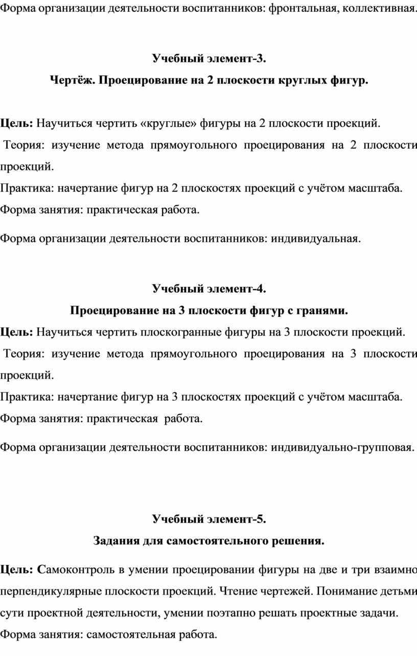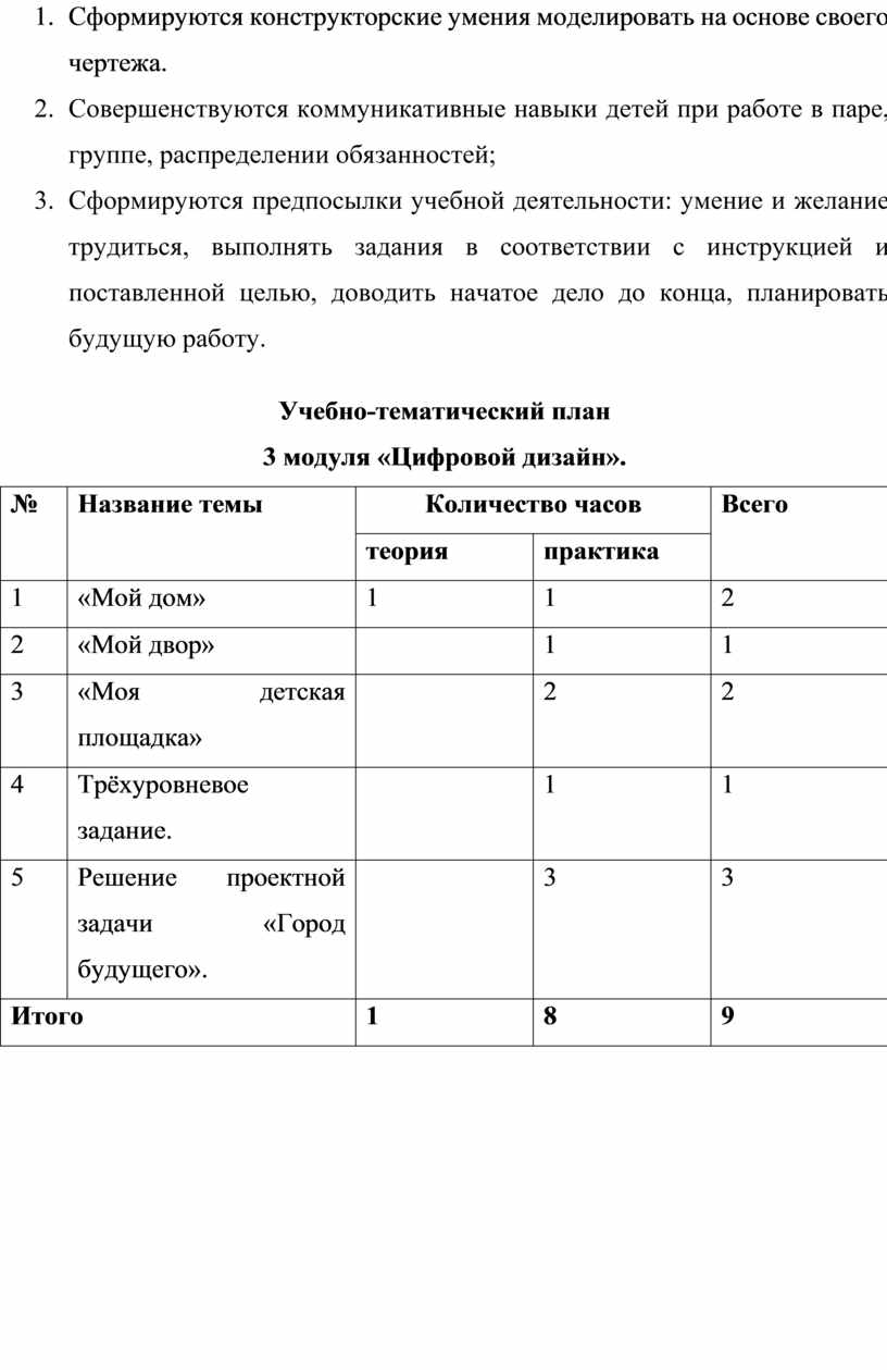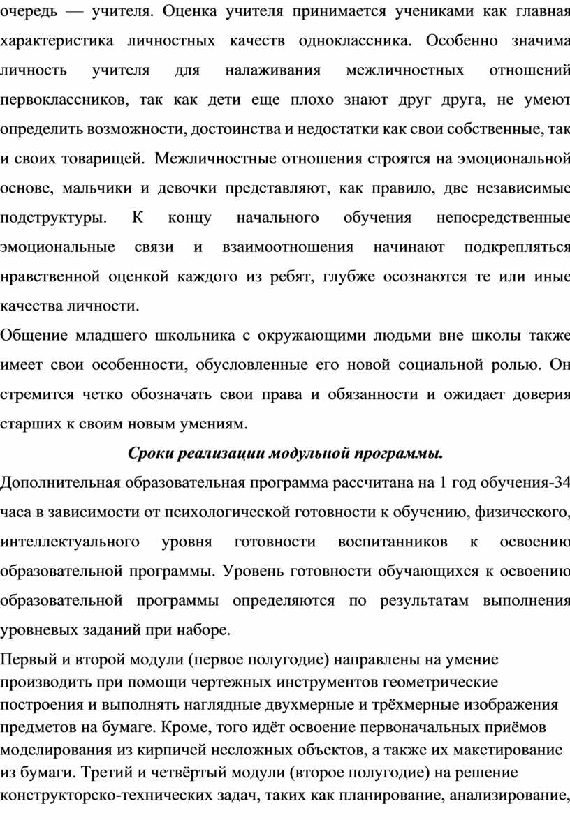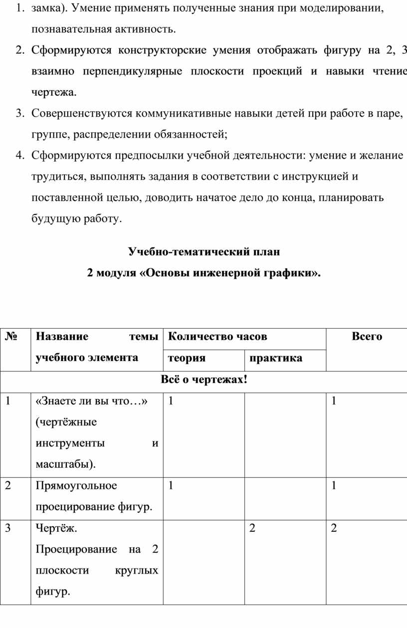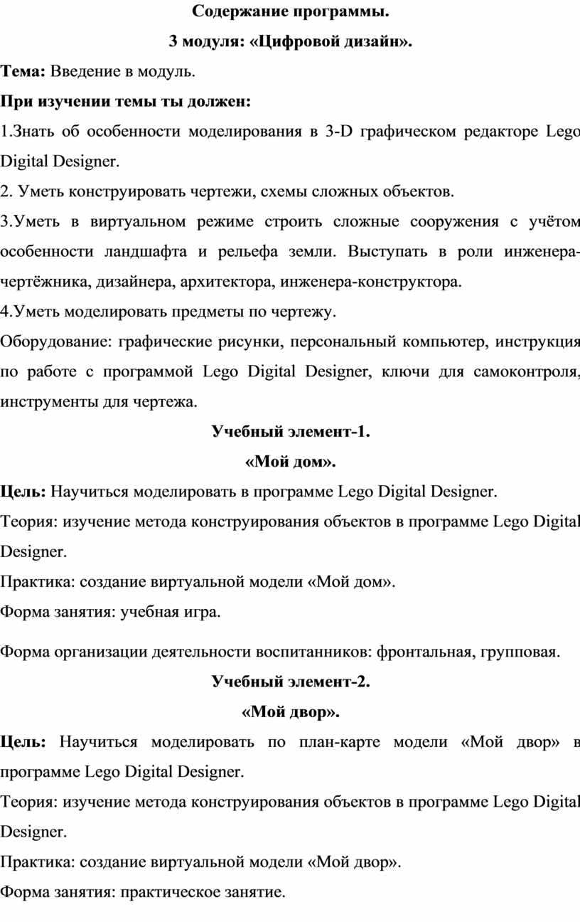 Первый и второй модули (первое полугодие) направлены на умение производить при помощи чертежных инструментов геометрические построения и выполнять наглядные двухмерные и трёхмерные изображения предметов на бумаге. Кроме, того идёт освоение первоначальных приёмов моделирования из кирпичей несложных объектов, а также их макетирование из бумаги. Третий и четвёртый модули (второе полугодие) на решение конструкторско-технических задач, таких как планирование, анализирование, проектирование в пространстве при помощи программы LEGO DIGITAL DESIGNER.