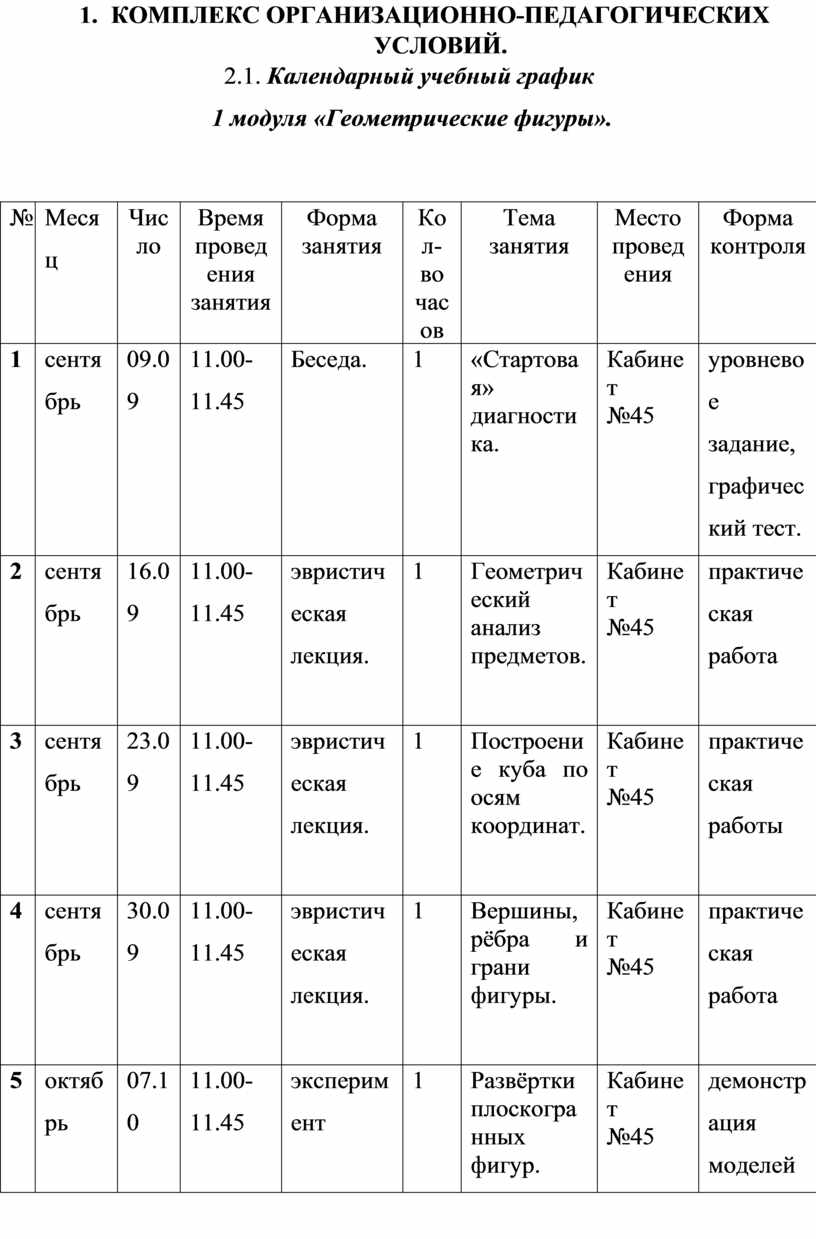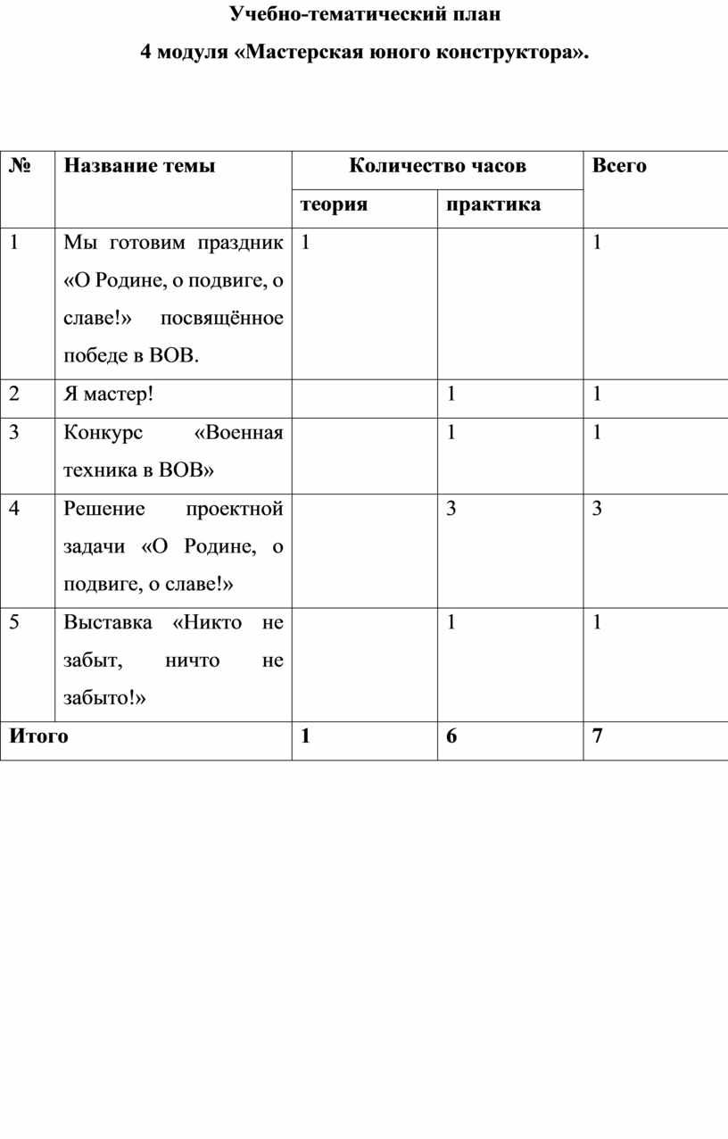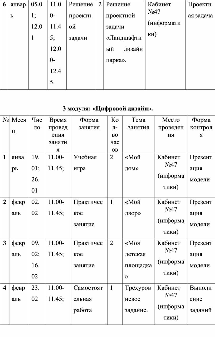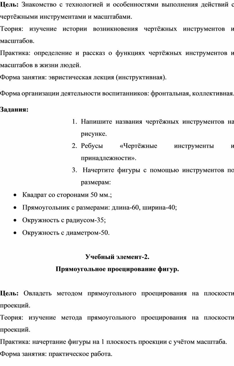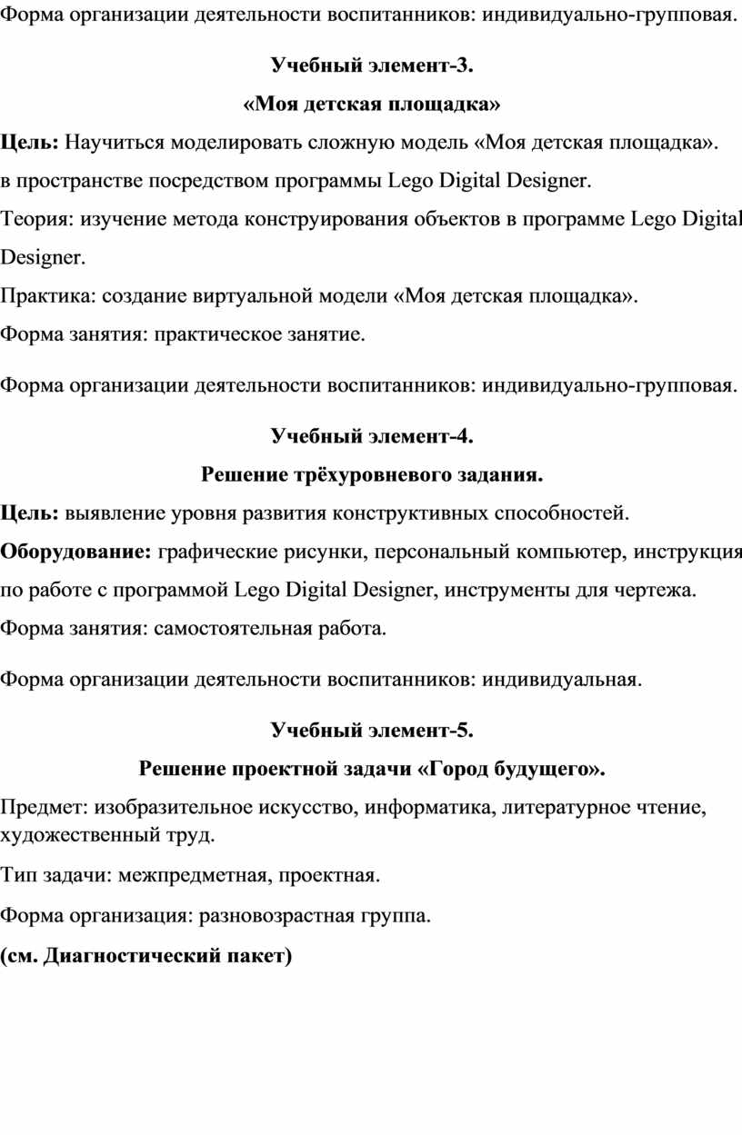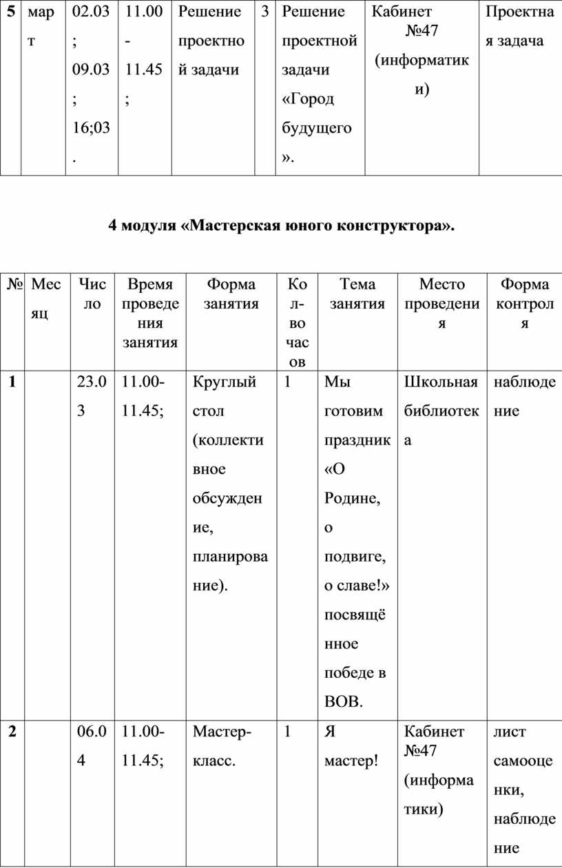 Первый и второй модули (первое полугодие) направлены на умение производить при помощи чертежных инструментов геометрические построения и выполнять наглядные двухмерные и трёхмерные изображения предметов на бумаге. Кроме, того идёт освоение первоначальных приёмов моделирования из кирпичей несложных объектов, а также их макетирование из бумаги. Третий и четвёртый модули (второе полугодие) на решение конструкторско-технических задач, таких как планирование, анализирование, проектирование в пространстве при помощи программы LEGO DIGITAL DESIGNER.