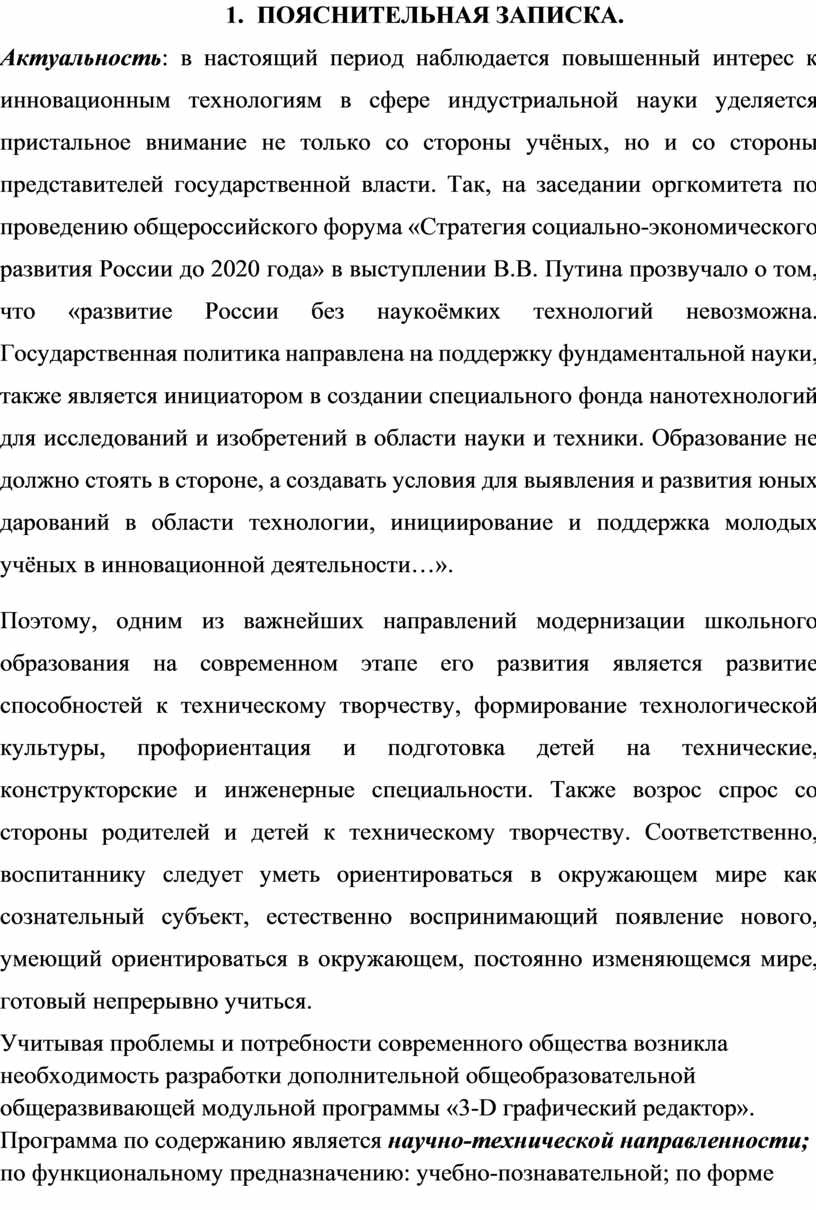 Учитывая проблемы и потребности современного общества возникла необходимость разработки дополнительной общеобразовательной общеразвивающей модульной программы «3-D графический редактор». Программа по содержанию является научно-технической направленности; по функциональному предназначению: учебно-познавательной; по форме организации: общедоступной; по содержанию: интегрированная, по времени реализации: годичной подготовки.