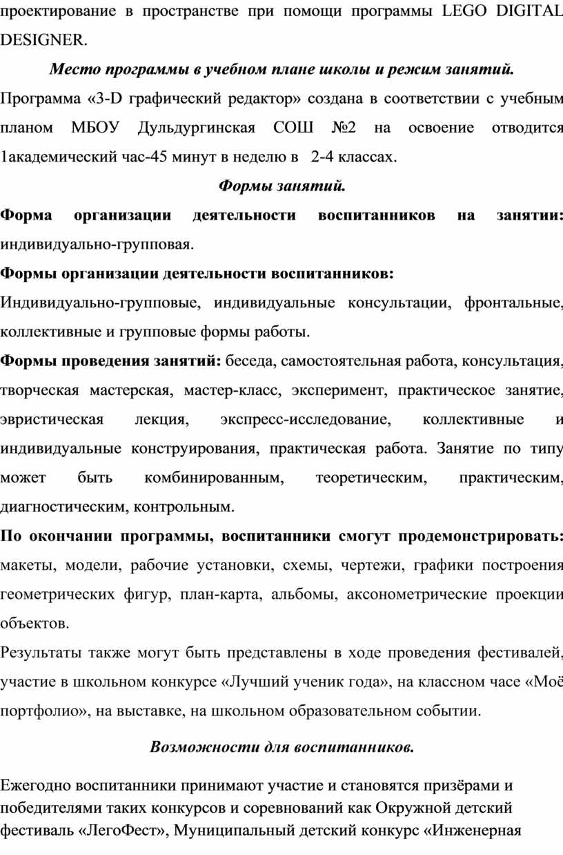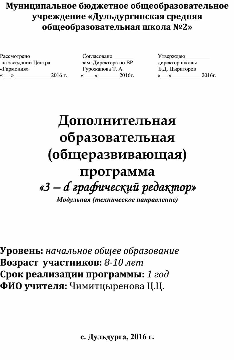 Программа «3-D графический редактор» создана в соответствии с учебным планом МБОУ Дульдургинская СОШ №2 на освоение отводится 1академический час-45 минут в неделю в 2-4 классах.