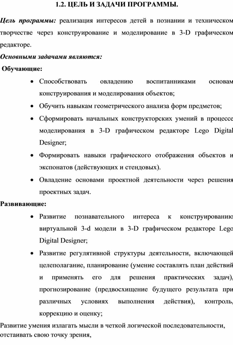 Цель программы: реализация интересов детей в познании и техническом творчестве через конструирование и моделирование в 3-D графическом редакторе.