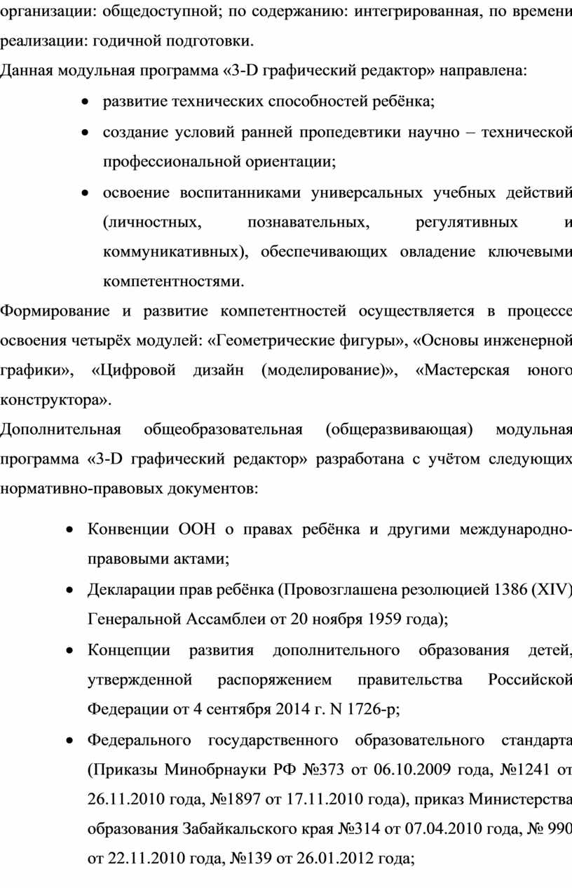 Дополнительная общеобразовательная (общеразвивающая) модульная программа «3-D графический редактор» разработана с учётом следующих нормативно-правовых документов: