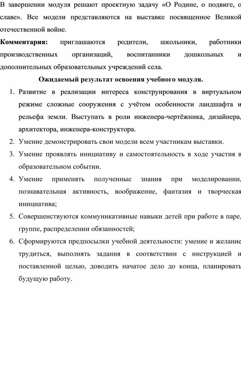 По окончании программы, воспитанники смогут продемонстрировать: макеты, модели, рабочие установки, схемы, чертежи, графики построения геометрических фигур, план-карта, альбомы, аксонометрические проекции объектов.