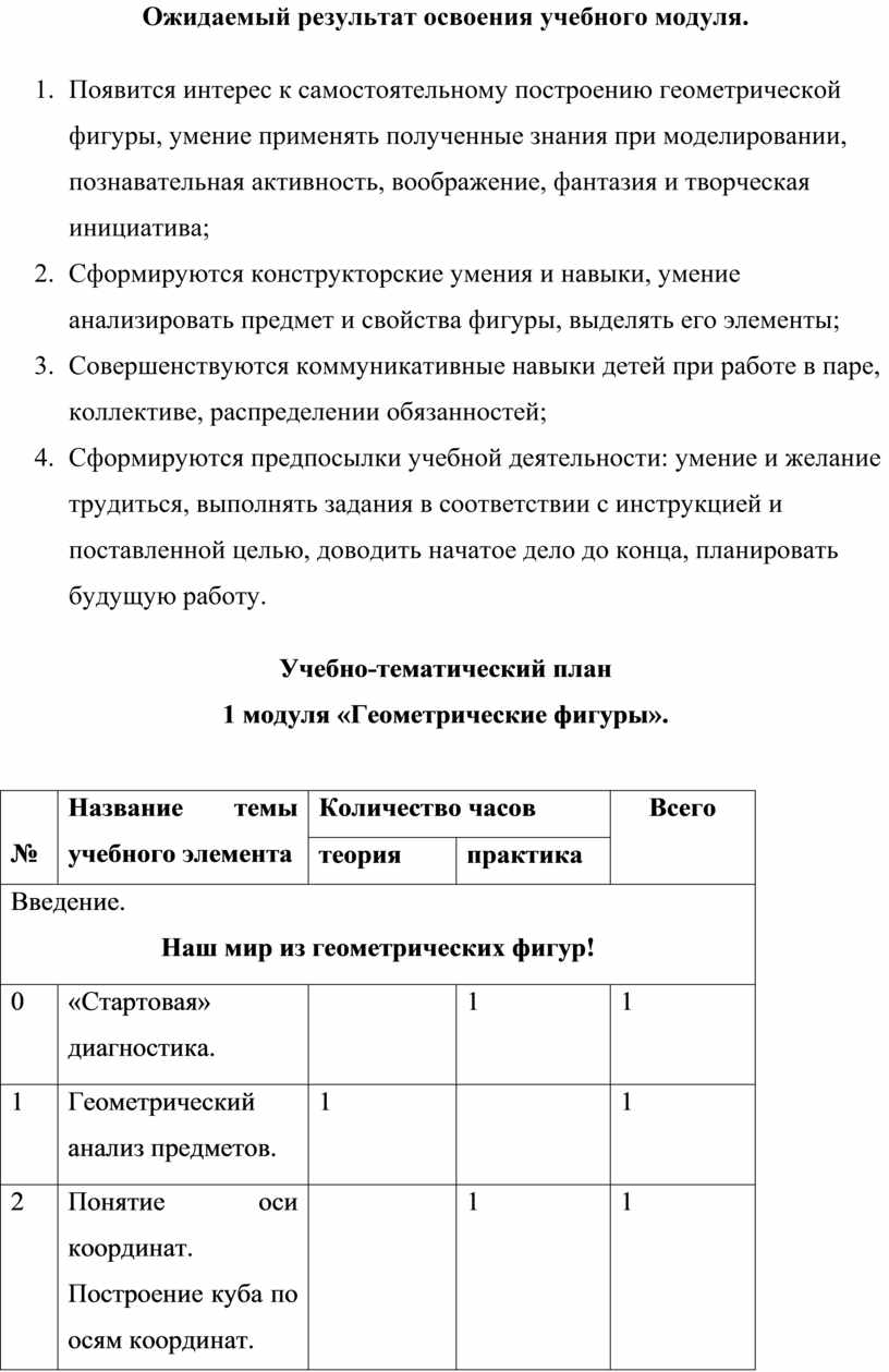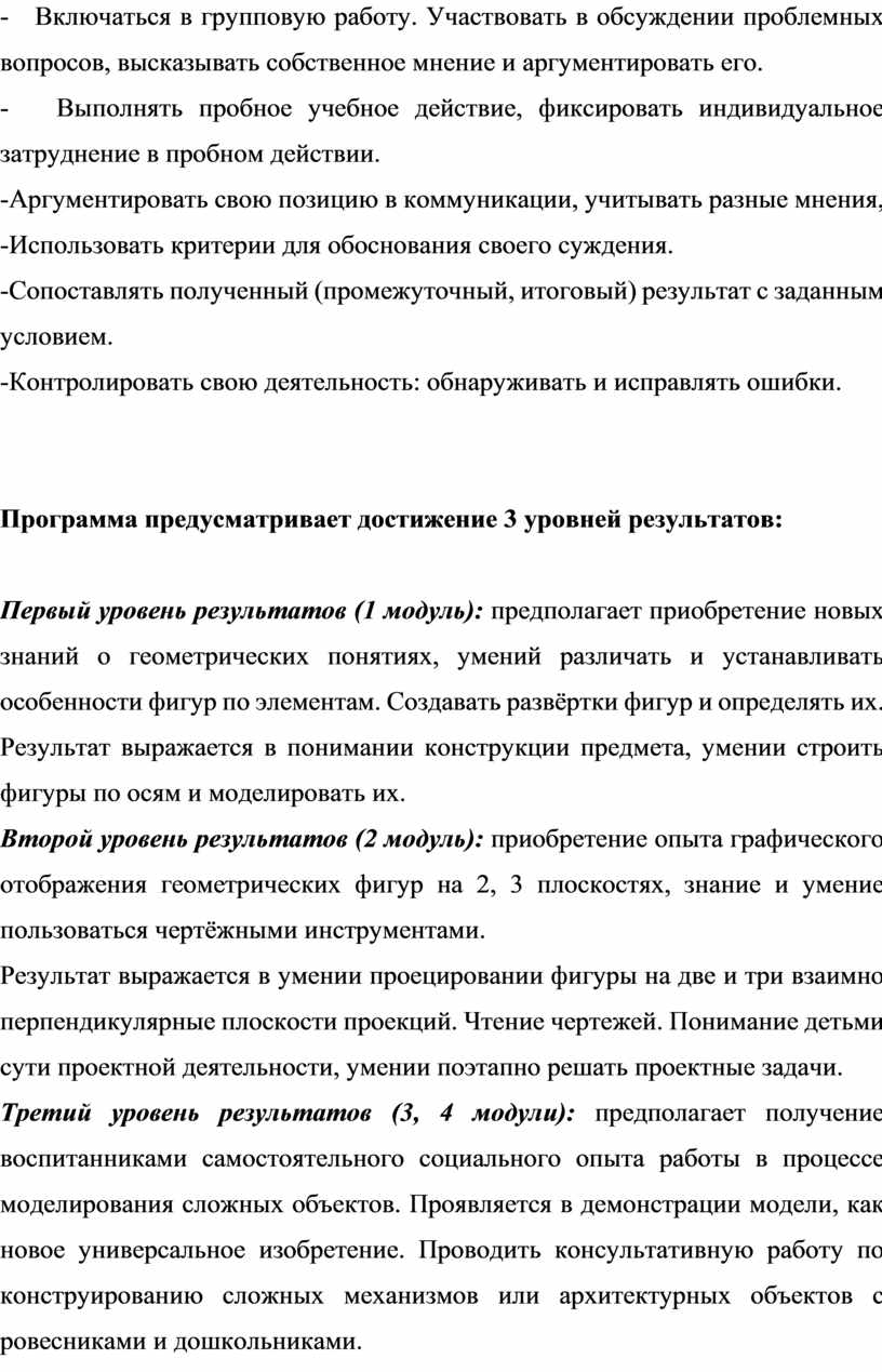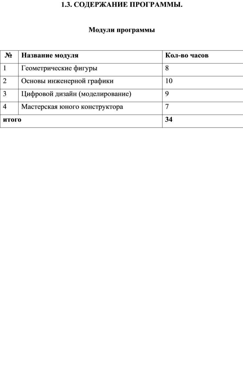 Формирование и развитие компетентностей осуществляется в процессе освоения четырёх модулей: «Геометрические фигуры», «Основы инженерной графики», «Цифровой дизайн (моделирование)», «Мастерская юного конструктора».