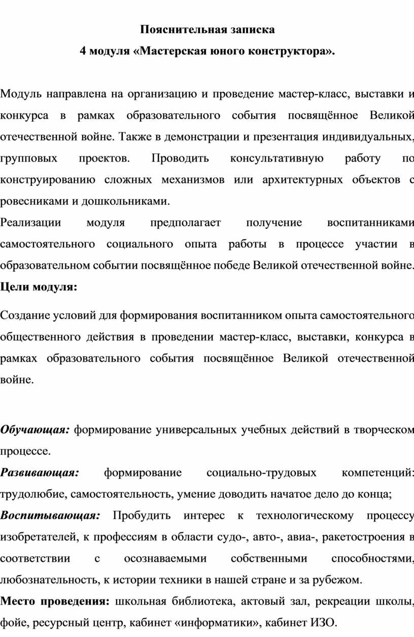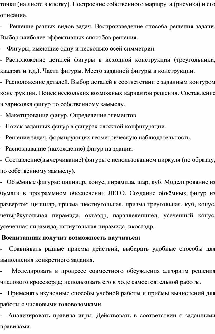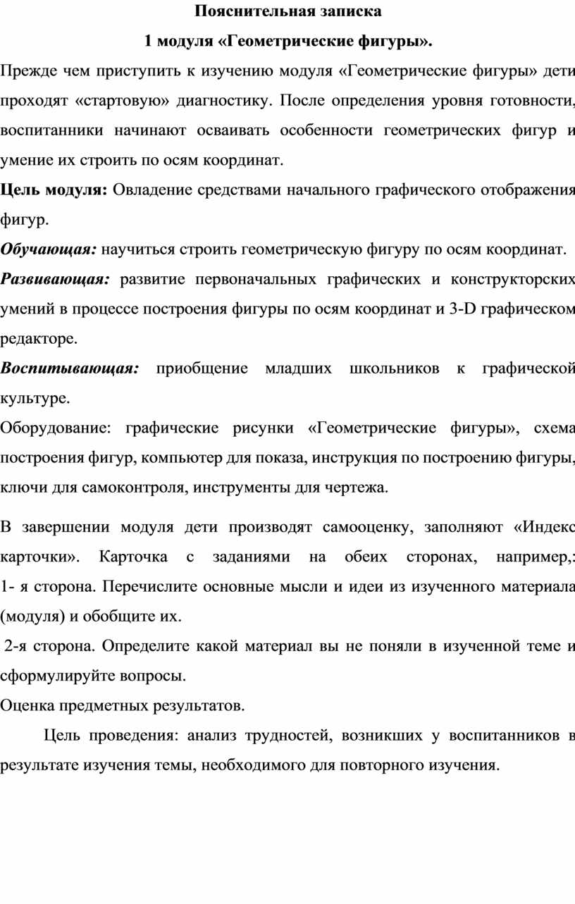 Формирование и развитие компетентностей осуществляется в процессе освоения четырёх модулей: «Геометрические фигуры», «Основы инженерной графики», «Цифровой дизайн (моделирование)», «Мастерская юного конструктора».
