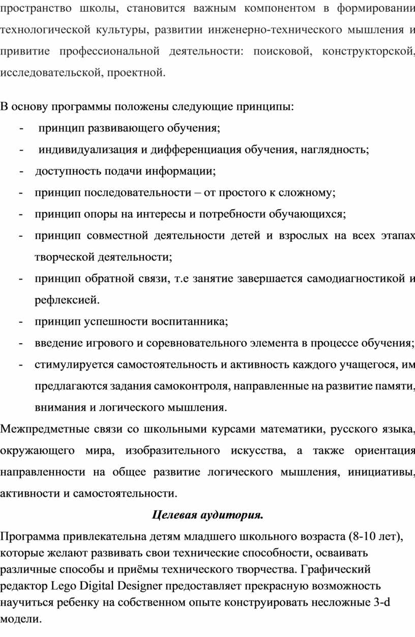 Программа привлекательна детям младшего школьного возраста (8-10 лет), которые желают развивать свои технические способности, осваивать различные способы и приёмы технического творчества. Графический редактор Lego Digital Designer предоставляет прекрасную возможность научиться ребенку на собственном опыте конструировать несложные 3-d модели. Самостоятельно добытые знания вызывают у детей желание двигаться по пути открытий и исследований, а любой признанный и оцененный успех добавляет уверенности в себе. Кроме того, обучение происходит особенно успешно, когда ребенок вовлечен в процесс создания значимого и осмысленного продукта, который представляет для него интерес и надёжно фиксируется в памяти. При этом учитель в совместном образовательном или творческом процессе с воспитанниками, занимает позицию консультанта.