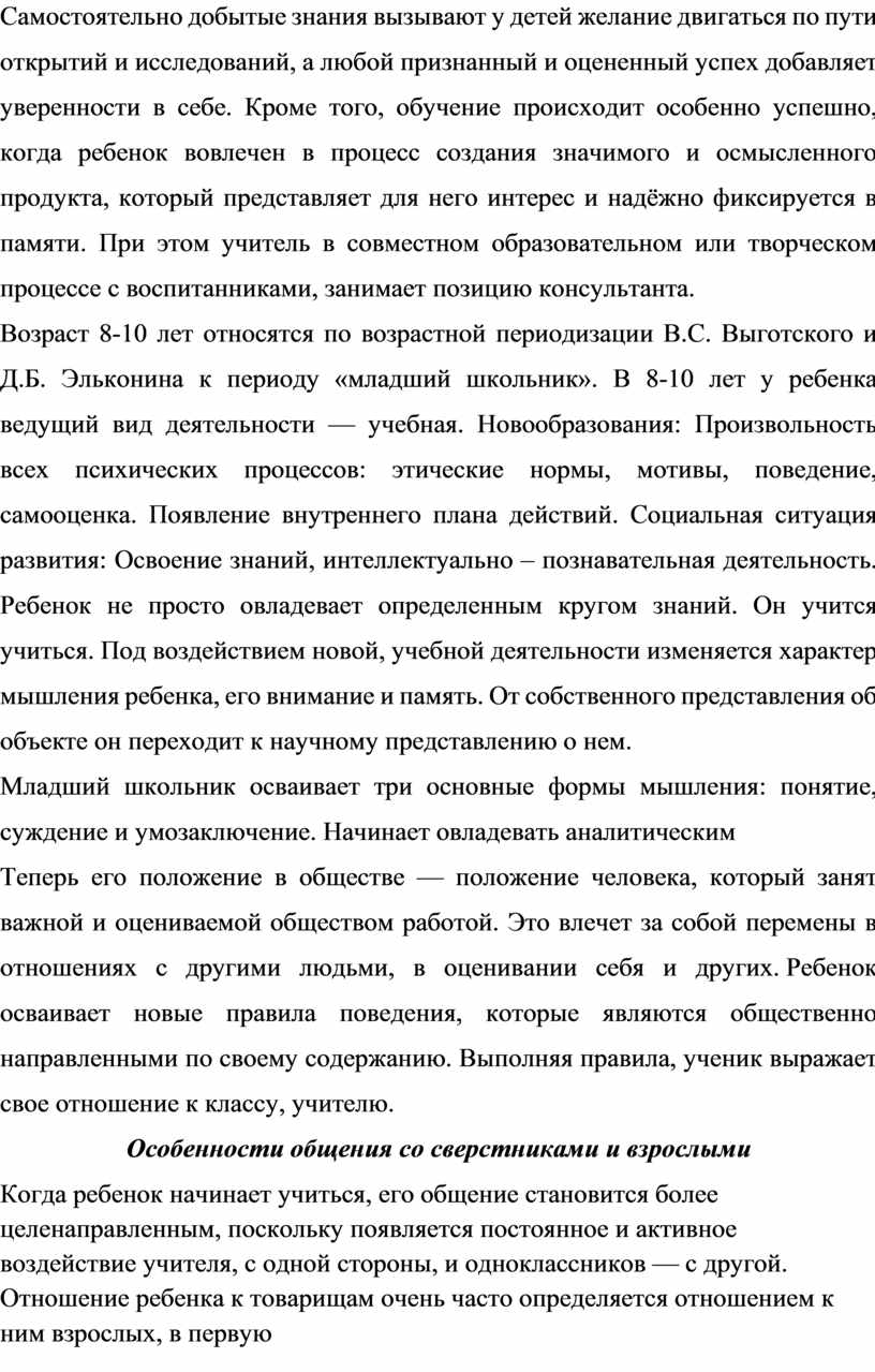 Возраст 8-10 лет относятся по возрастной периодизации В.С. Выготского и Д.Б. Эльконина к периоду «младший школьник». В 8-10 лет у ребенка ведущий вид деятельности — учебная. Новообразования: Произвольность всех психических процессов: этические нормы, мотивы, поведение, самооценка. Появление внутреннего плана действий. Социальная ситуация развития: Освоение знаний, интеллектуально – познавательная деятельность. Ребенок не просто овладевает определенным кругом знаний. Он учится учиться. Под воздействием новой, учебной деятельности изменяется характер мышления ребенка, его внимание и память. От собственного представления об объекте он переходит к научному представлению о нем.