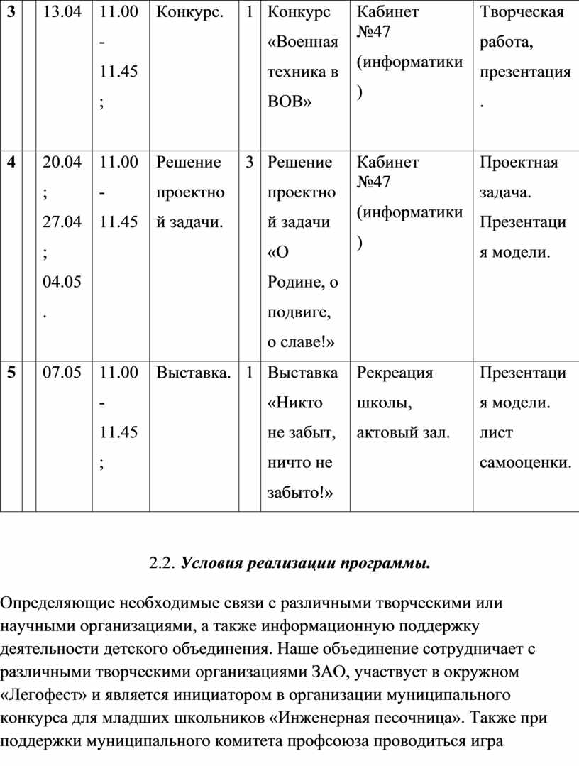 2. Материально-технические условия, необходимые для деятельности детского объединения: