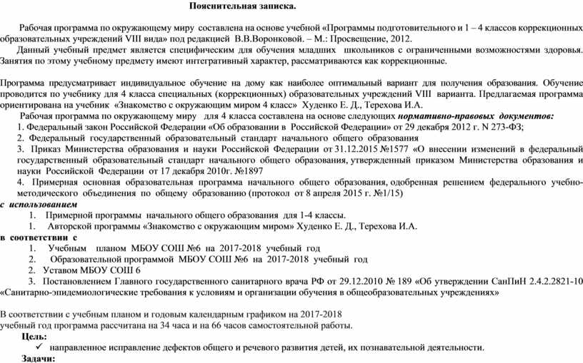 Программа предусматривает индивидуальное обучение на дому как наиболее оптимальный вариант для получения образования. Обучение проводится по учебнику для 4 класса специальных (коррекционных) образовательных учреждений VIII варианта. Предлагаемая программа ориентирована на учебник «Знакомство с окружающим миром 4 класс» Худенко Е. Д., Терехова И.А.