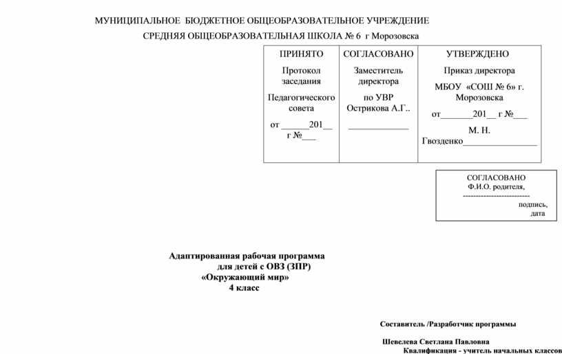 УТВЕРЖДЕНО Приказ директора МБОУ «СОШ № 6» г. Морозовска от_______201__ г №___ М. Н. Гвозденко________________ |