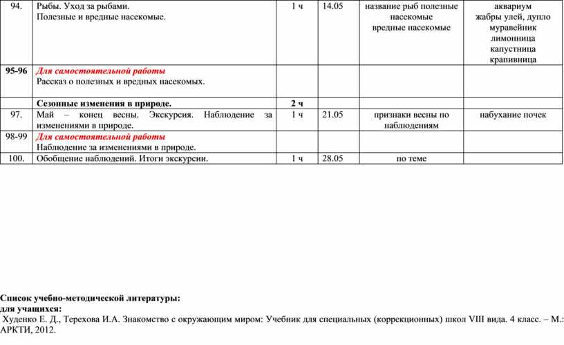 Худенко Е. Д., Терехова И.А. Знакомство с окружающим миром: Учебник для специальных (коррекционных) школ VIII вида. 4 класс. – М.: АРКТИ, 2012.