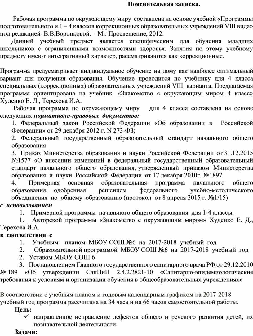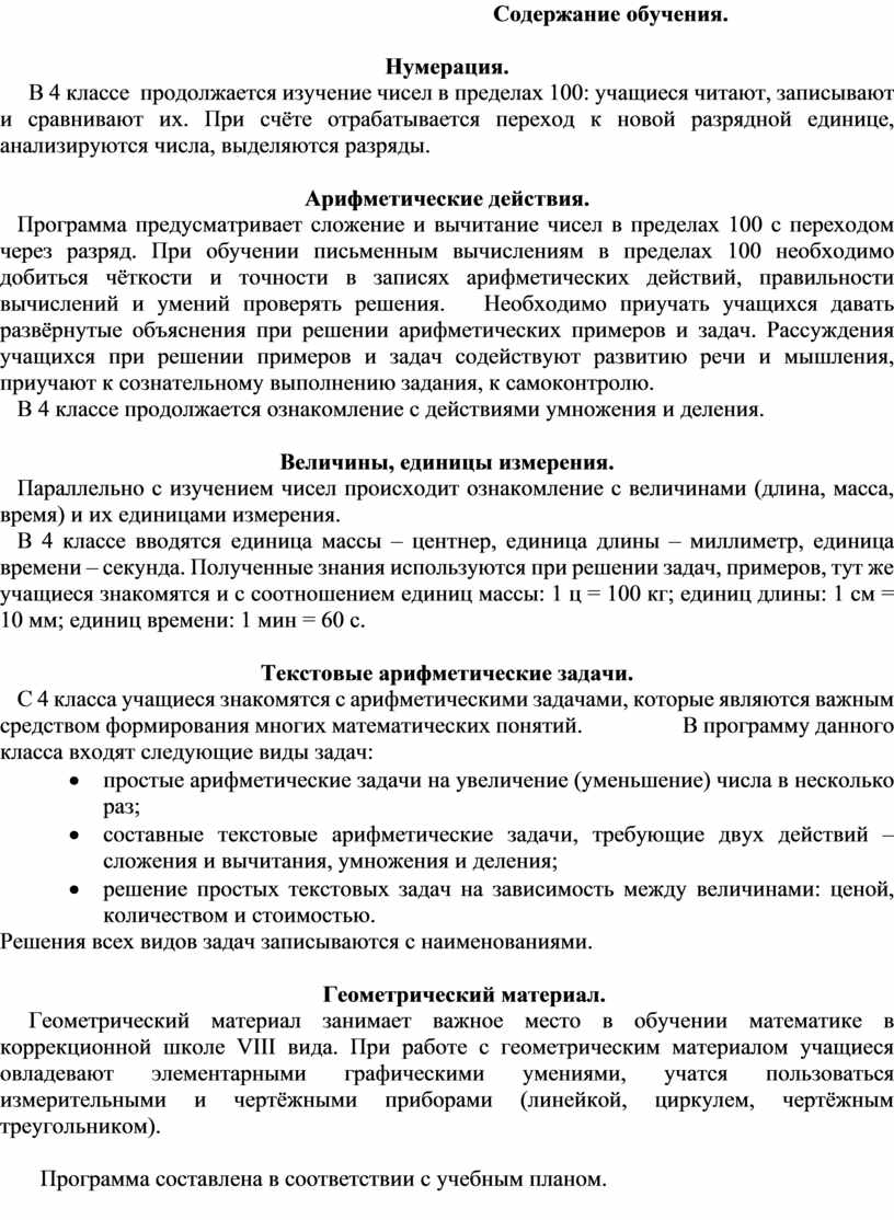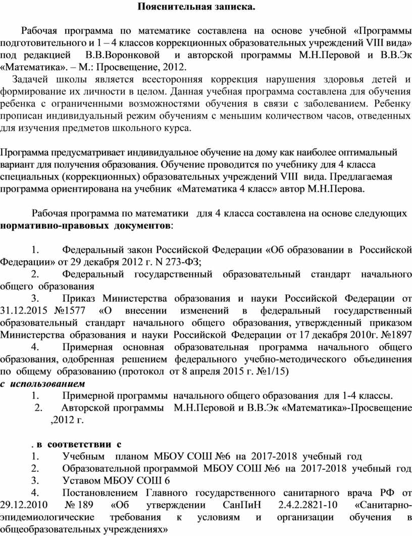 Программа предусматривает индивидуальное обучение на дому как наиболее оптимальный вариант для получения образования. Обучение проводится по учебнику для 4 класса специальных (коррекционных) образовательных учреждений VIII вида. Предлагаемая программа ориентирована на учебник «Математика 4 класс» автор М.Н.Перова.