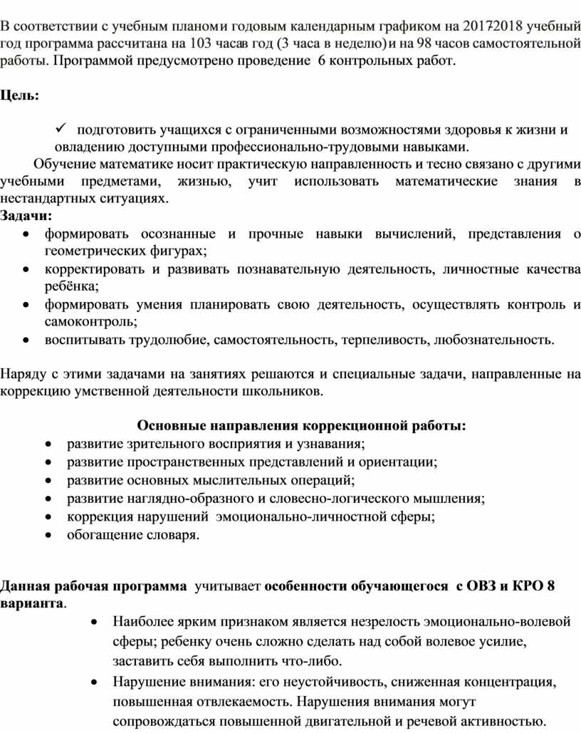 В соответствии с учебным планом и годовым календарным графиком на 2017-2018 учебный год программа рассчитана на 103 часа в год (3 часа в неделю) и на 98 часов самостоятельной работы. Программой предусмотрено проведение 6 контрольных работ.