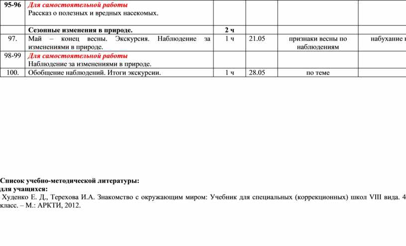 Худенко Е. Д., Терехова И.А. Знакомство с окружающим миром: Учебник для специальных (коррекционных) школ VIII вида. 4 класс. – М.: АРКТИ, 2012.