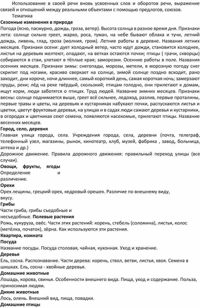 Погода (ясно, пасмурно, дождь, гроза, ветер). Высота солнца в разное время дня. Признаки лета: солнце сильно греет, жарко, роса, туман, на небе бывают облака и тучи, летний дождь, ливень, глад, гроза (молния, гром). Летние работы в деревне. Названия летних месяцев. Признаки осени: дует холодный ветер, часто идут дожди, становится холоднее, листья на деревьях желтеют, опадают, на ветках остаются почки; птицы ( грачи, скворцы) собираются в стаи, улетают в тёплые края; заморозки. Осенние работы в поле. Названия осенних месяцев. Признаки зимы: снегопады, морозы, метели, в морозную погоду снег скрипит под ногами, красиво сверкает на солнце, зимой солнце поздно всходит, рано заходит, дни короче, ночи длиннее, самый короткий день, самая короткая ночь; замерзают пруды, реки; лёд на реке твёрдый, скользкий; птицам голодно, они прилетают к домам, ищут корм, люди заботятся о птицах. Труд людей. Название зимних месяцев. Признаки весны: солнце поднимается выше, греет всё сильнее, ледоход, разлив, первые проталины, первые травы и цветы, на деревьях и кустарниках набухают почки, распускаются листья и цветки, цветут фруктовые деревья, на улицах и в садах люди сажают деревья и кустарники, в огородах и цветниках сеют семена, появляются насекомые, прилетают птицы. Название весенних месяцев.