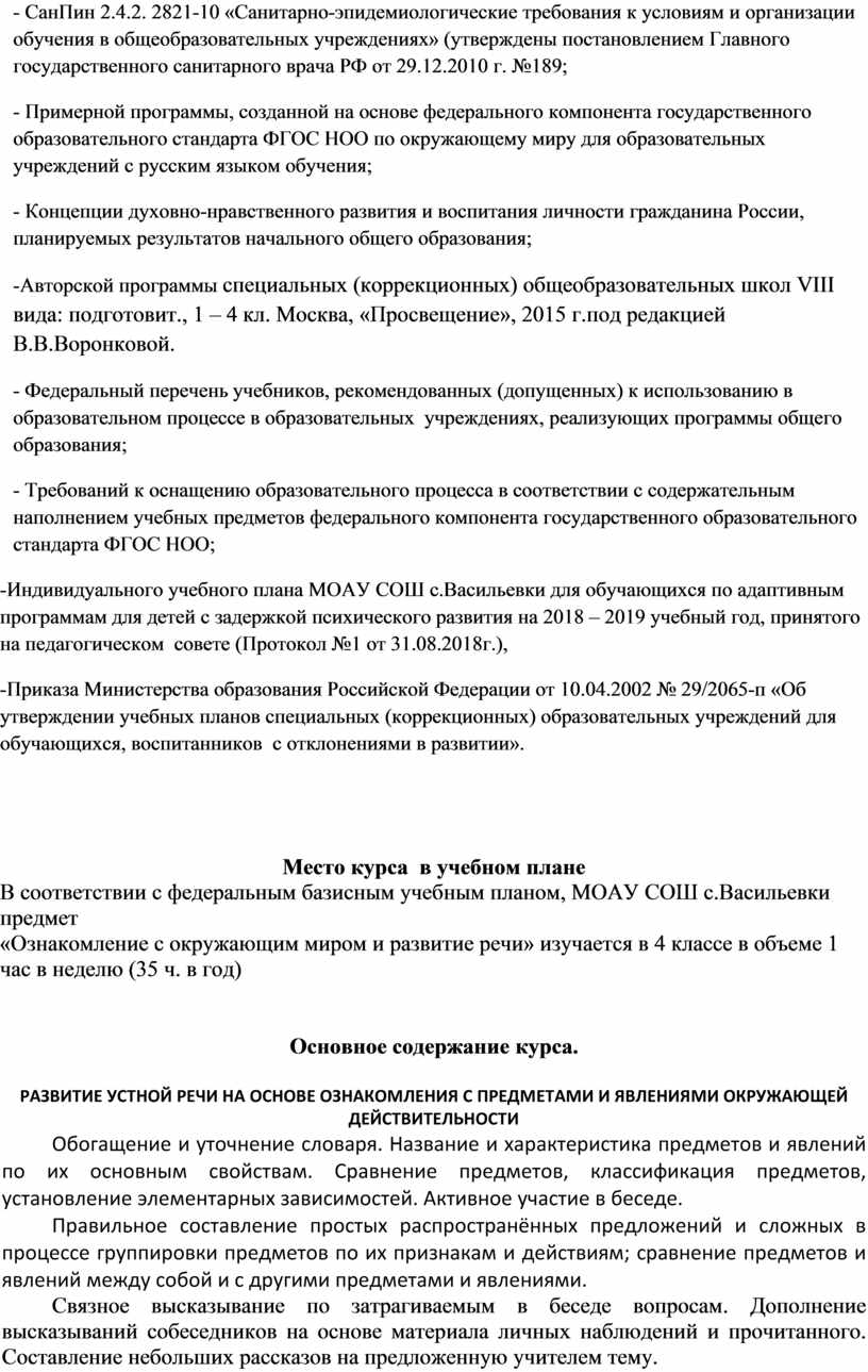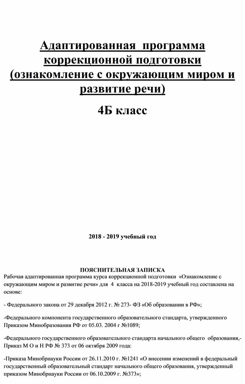 Рабочая адаптированная программа курса коррекционной подготовки «Ознакомление с окружающим миром и развитие речи» для 4 класса на 2018-2019 учебный год составлена на основе: