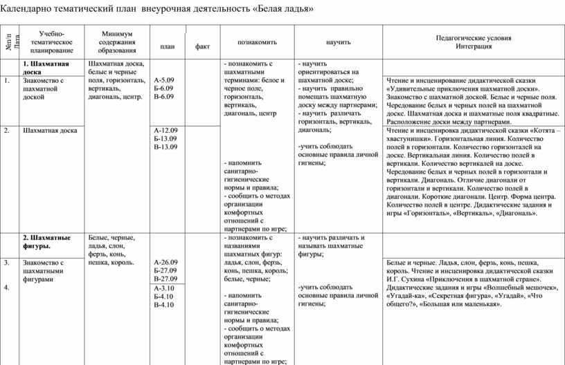 Календарно тематический план внеурочная деятельность «Белая ладья»