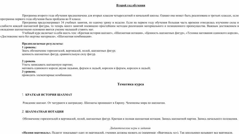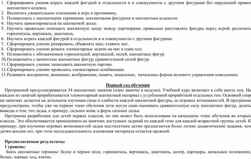 Программой предусматривается 34 шахматных занятия (одно занятие в неделю). Учебный курс включает в себя шесть тем. Ha каждом из занятий прорабатывается элементарный шахматный материал с углубленной проработкой отдельных тем. Основной упор на занятиях делается на детальном изучении силы и слабости каждой шахматной фигуры, ее игровых возможностей. В программе предусмотрено, чтобы уже на первом этапе обучения дети могли сами оценивать сравнительную силу шахматных фигур, делать выводы о том, что ладья, к примеру, сильнее коня, а ферзь сильнее ладьи.