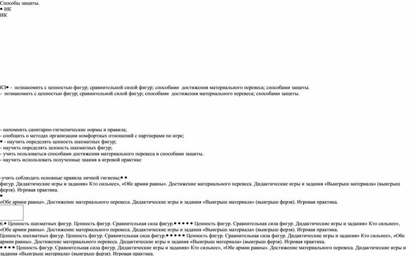 - познакомить с ценностью фигур; сравнительной силой фигур; способами достижения материального перевеса; способами защиты.