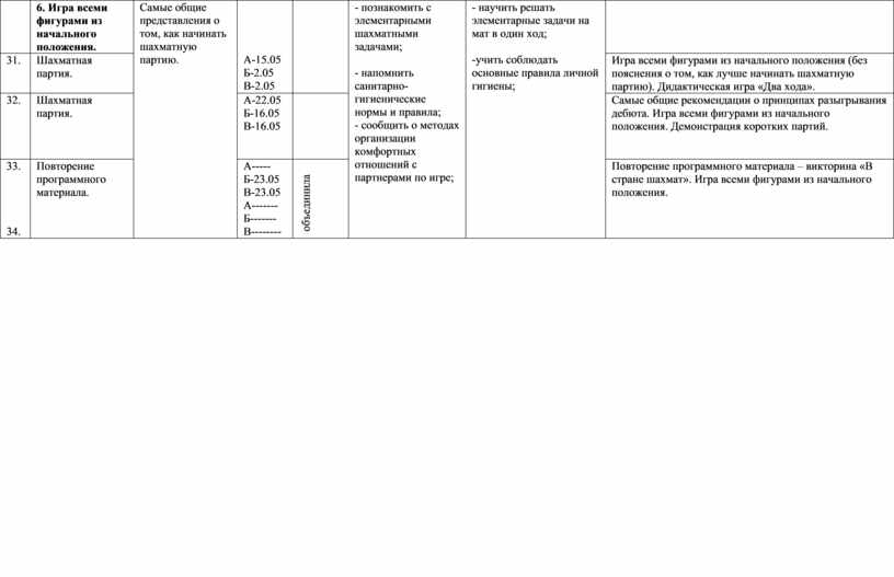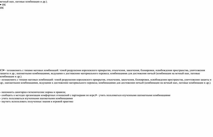 - познакомить с типами матовых комбинаций: темой разрушения королевского прикрытия, отвлечения, завлечения, блокировки, освобождения пространства, уничтожения защиты и др.; шахматными комбинациями, ведущими к достижению материального перевеса; комбинациями для достижения ничьей (комбинации на вечный шах, патовые комбинации и др.).