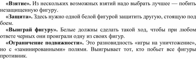 Достижение мата путем жертвы шахматного материала (матовые комбинации). Типы матовых комбинаций: темы разрушения королевского прикрытия, отвлечения, завлечения, блокировки, освобождения пространства, уничтожения защиты и др. Шахматные комбинации, ведущие к достижению материального перевеса. Комбинации для достижения ничьей (комбинации на вечный шах, патовые комбинации и др.).
