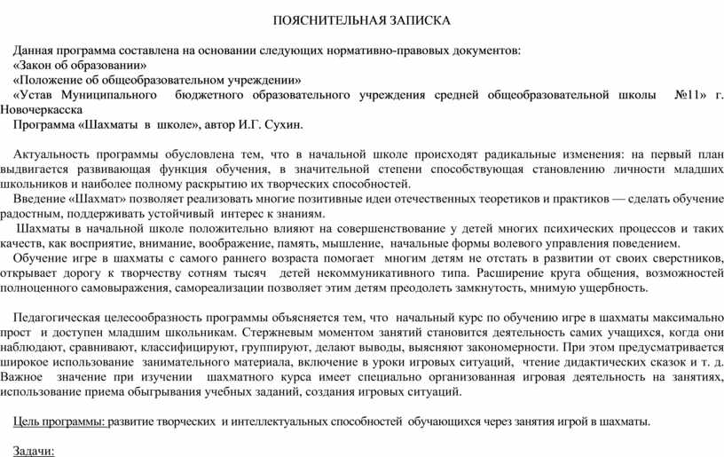 Программа «Шахматы в школе», автор И.Г. Сухин.