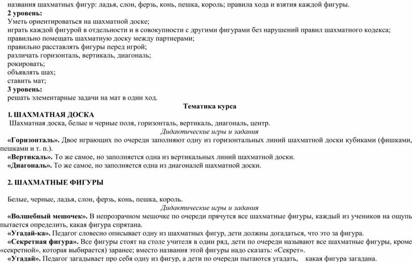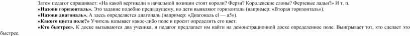Обозначение горизонталей, вертикалей, полей. Дидактические игры и задания «Назови вертикаль», «Назови горизонталь», «Назови диагональ», «Какого цвета поле», «Кто быстрее», «Вижу цель». Игровая практика. На этом занятии дети, делая ход, проговаривают, какая фигура с какого поля на какое идет. Например: «Король с е1 – на е2».
