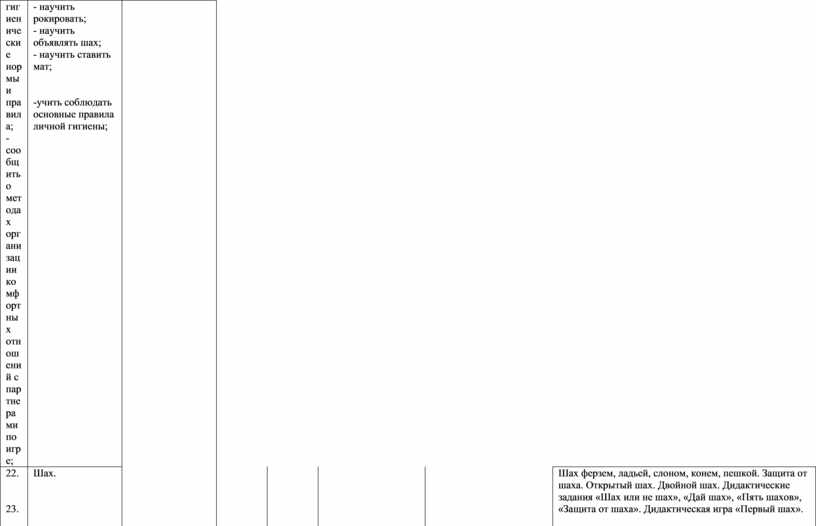 Учебные положения на мат в два хода в дебюте. Дидактические игры и задания «Объяви мат в два хода». Защита от мата. Дидактические игры и задания «Защитись от мата». Игровая практика. |