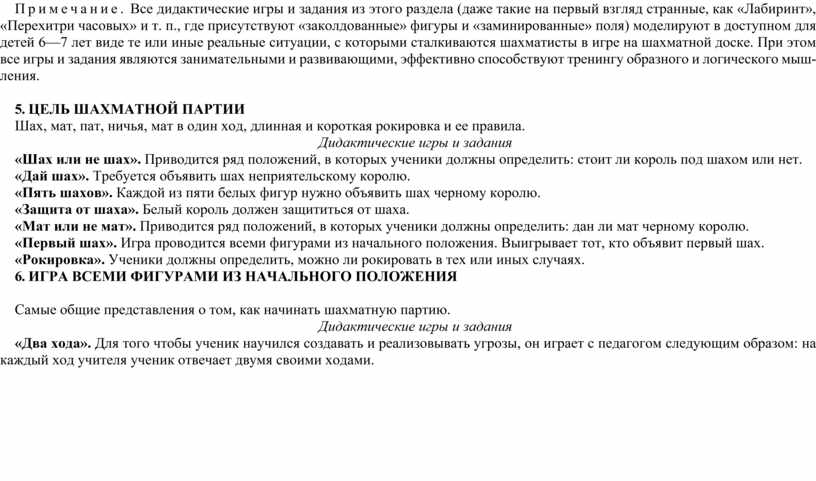 Примечание. Все дидактические игры и задания из этого раздела (даже такие на первый взгляд странные, как «Лабиринт», «Перехитри часовых» и т. п., где присутствуют «заколдованные» фигуры и «заминированные» поля) моделируют в доступном для детей 6—7 лет виде те или иные реальные ситуации, с которыми сталкиваются шахматисты в игре на шахматной доске. При этом все игры и задания являются занимательными и развивающими, эффективно способствуют тренингу образного и логического мышления.
