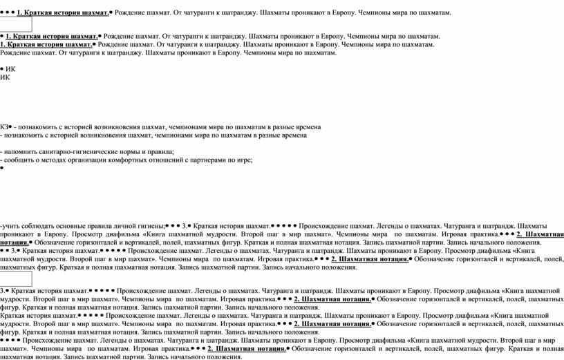 Обозначение шахматных фигур и терминов. Запись начального положения. Краткая и полная шахматная нотация. Запись шахматной партии. Игровая практика (с записью шахматной партии или фрагмента шахматной партии). |