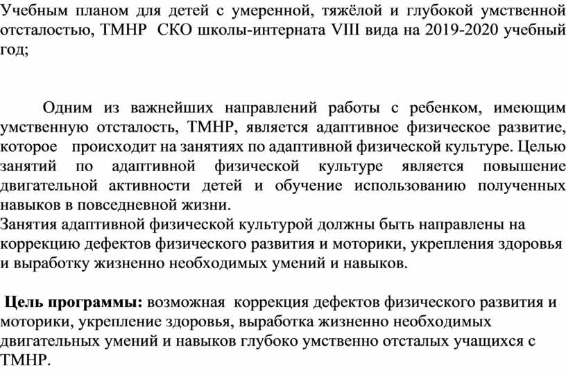 Цель программы: возможная коррекция дефектов физического развития и моторики, укрепление здоровья, выработка жизненно необходимых двигательных умений и навыков глубоко умственно отсталых учащихся с ТМНР.