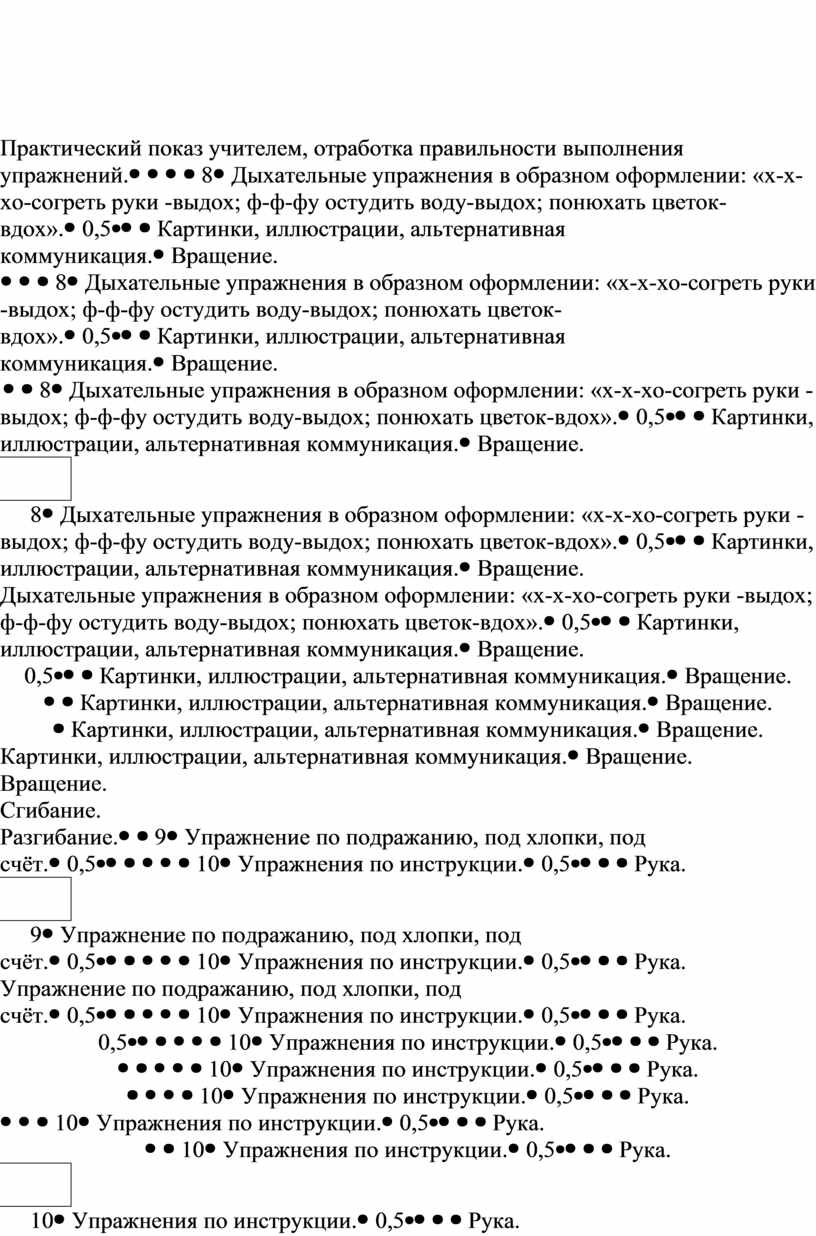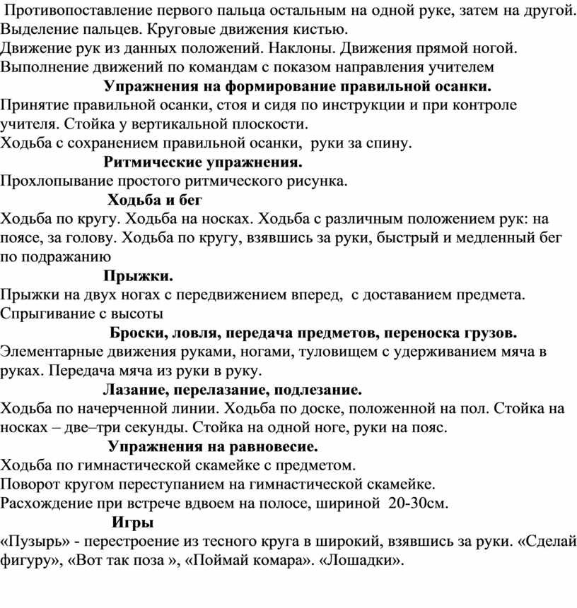 Упражнения по возможности для развития и коррекции общей и мелкой моторики: упражнения с большими и малыми мячами, гимнастической палкой, набивными мячами, обручем, скакалкой, шнуром, флажками, лестницей, скамейкой из различных исходных положений; пальчиковая гимнастика.