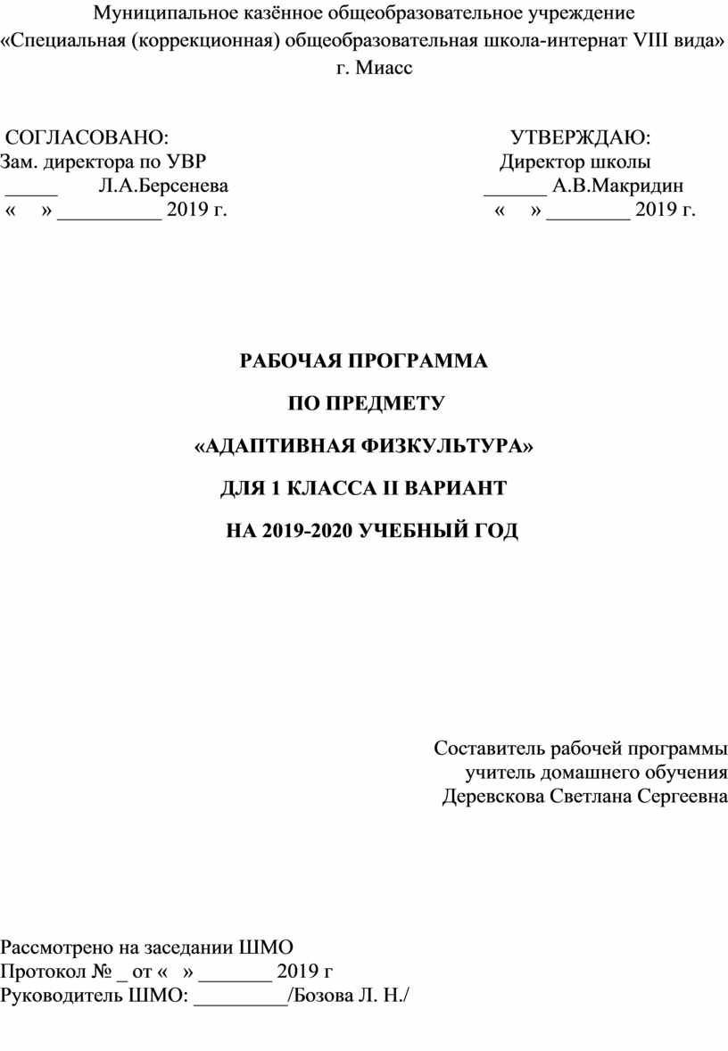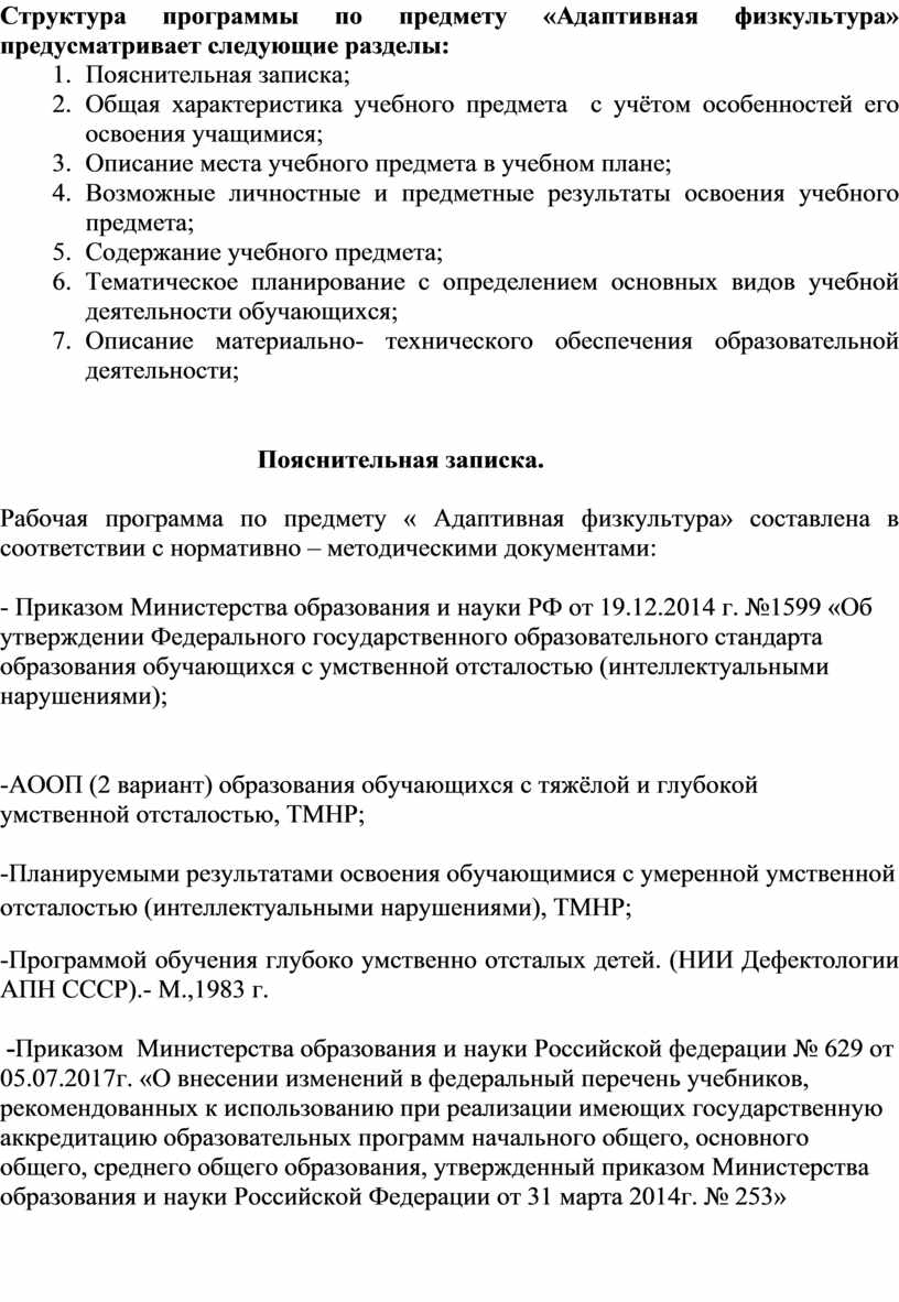 Рабочая программа по предмету « Адаптивная физкультура» составлена в соответствии с нормативно – методическими документами: