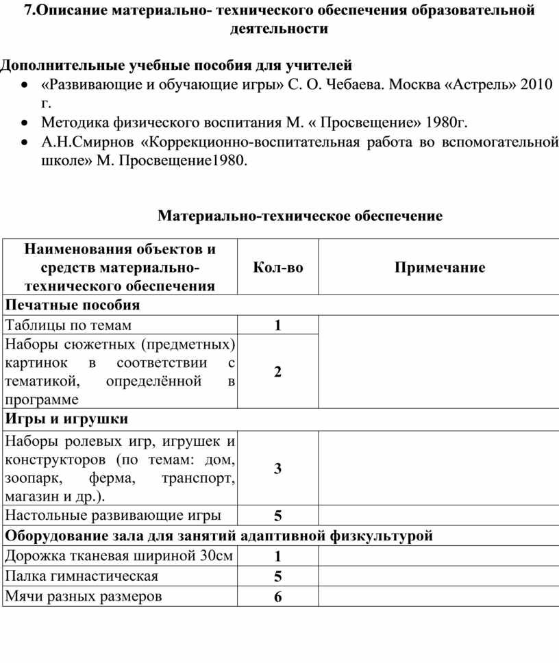 7. Описание материально- технического обеспечения образовательной деятельности;
