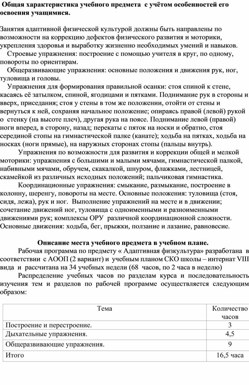 Рабочая программа по предмету « Адаптивная физкультура» разработана в соответствии с АООП (2 вариант) и учебным планом СКО школы – интернат VIII вида и рассчитана на 34 учебных недели (68 часов, по 2 часа в неделю)