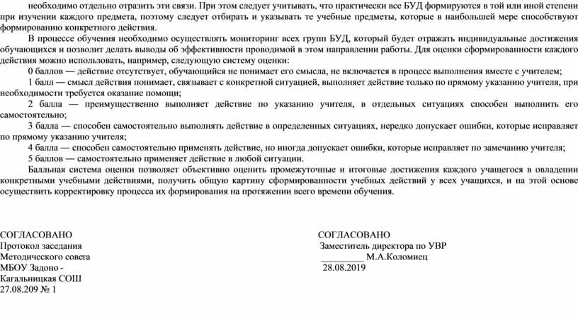В процессе обучения необходимо осуществлять мониторинг всех групп БУД, который будет отражать индивидуальные достижения обучающихся и позволит делать выводы об эффективности проводимой в этом направлении работы. Для оценки сформированности каждого действия можно использовать, например, следующую систему оценки: