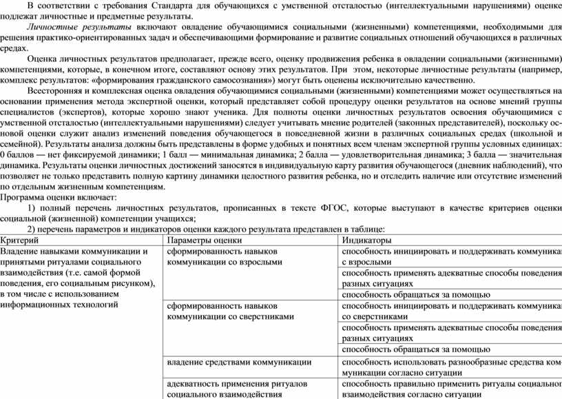 Всесторонняя и комплексная оценка овладения обучающимися социальными (жизненными) компетенциями может осуществляться на основании применения метода экспертной оценки, который представляет собой процедуру оценки результатов на основе мнений группы специалистов (экспертов), которые хорошо знают ученика. Для полноты оценки личностных результатов освоения обучающимися с умственной отсталостью (интеллектуальными нарушениями) следует учитывать мнение родителей (законных представителей), поскольку основой оценки служит анализ изменений поведения обучающегося в повседневной жизни в различных социальных средах (школьной и семейной). Результаты анализа должны быть представлены в форме удобных и понятных всем членам экспертной группы условных единицах: 0 баллов ― нет фиксируемой динамики; 1 балл ― минимальная динамика; 2 балла ― удовлетворительная динамика; 3 балла ― значительная динамика. Результаты оценки личностных достижений заносятся в индивидуальную карту развития обучающегося (дневник наблюдений), что позволяет не только представить полную картину динамики целостного развития ребенка, но и отследить наличие или отсутствие изменений по отдельным жизненным компетенциям.